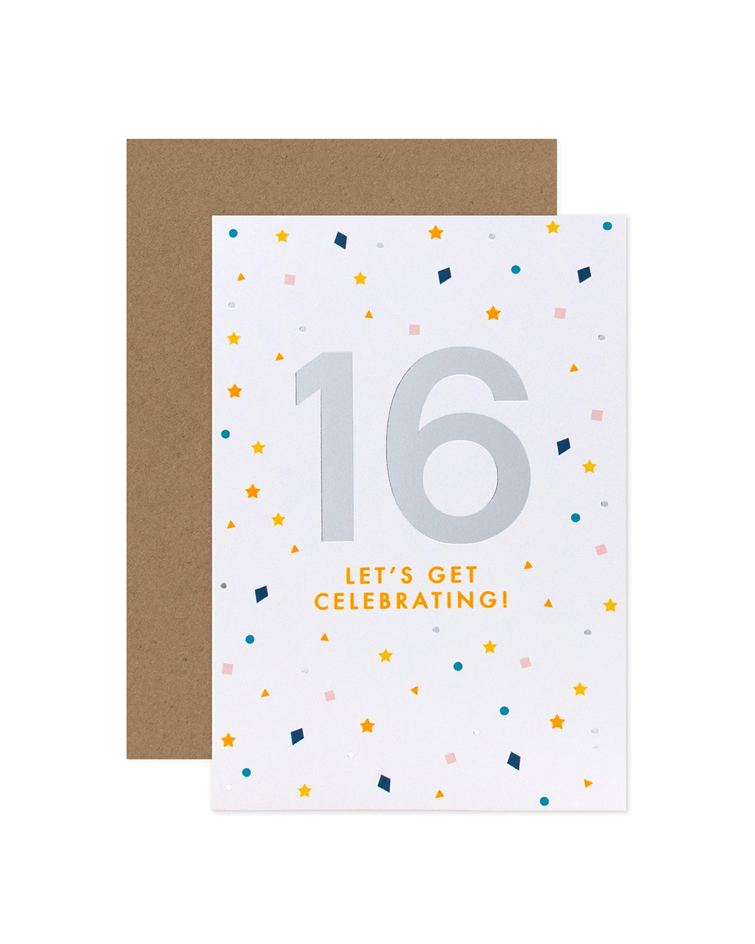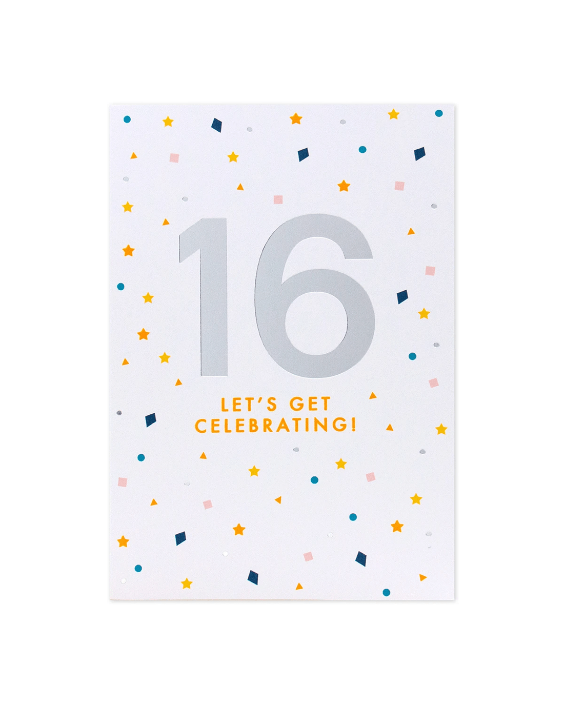 • Front of card features the number 16 in silver foil and petite neon stars and the message reading 'Let's get celebrating!'