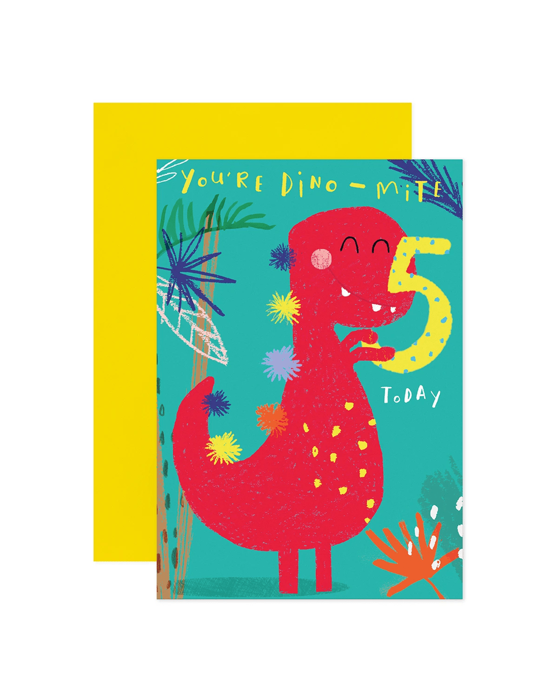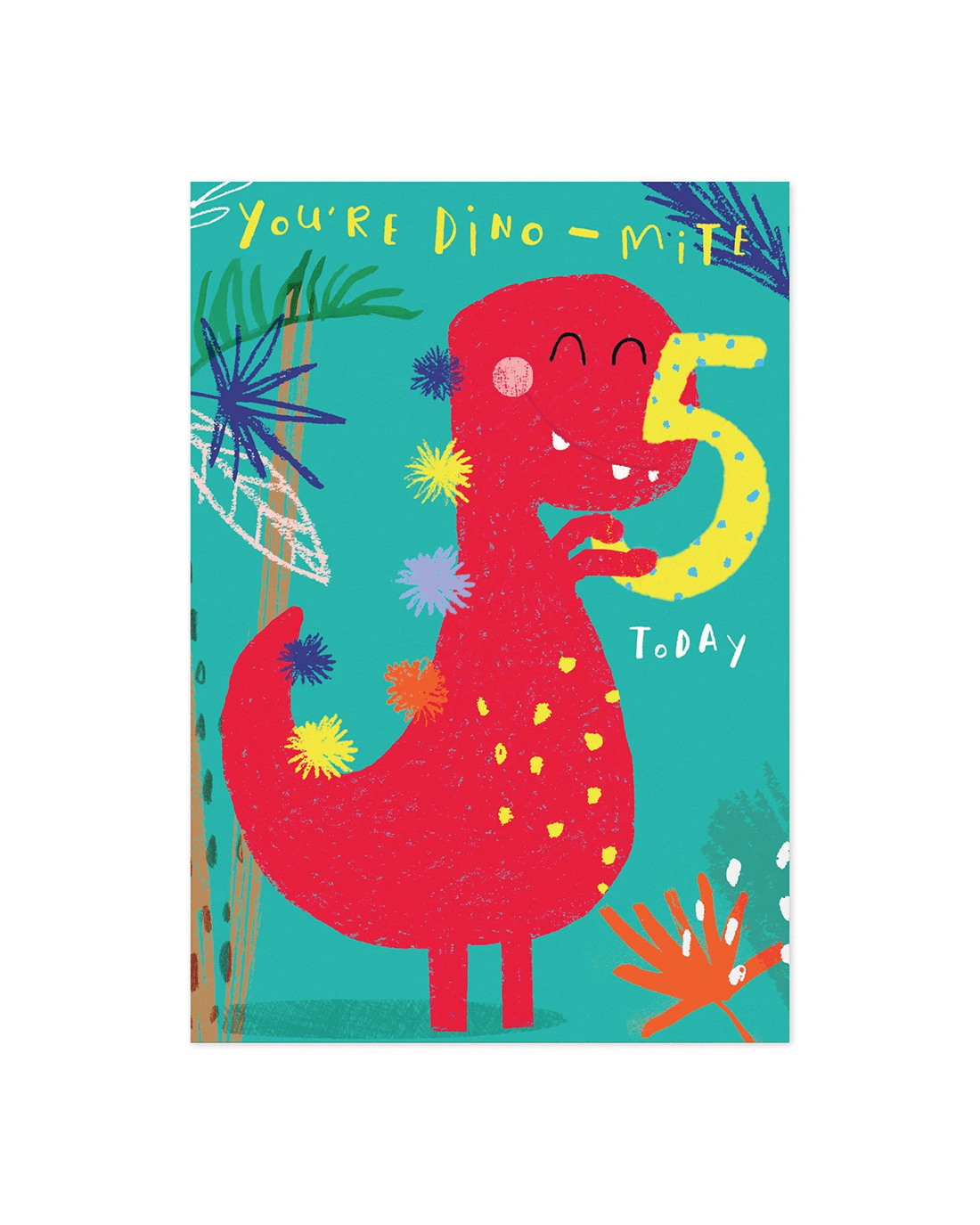 • Front of card features a bright red dinosaur and the message 'You're dino-mite 5 today'