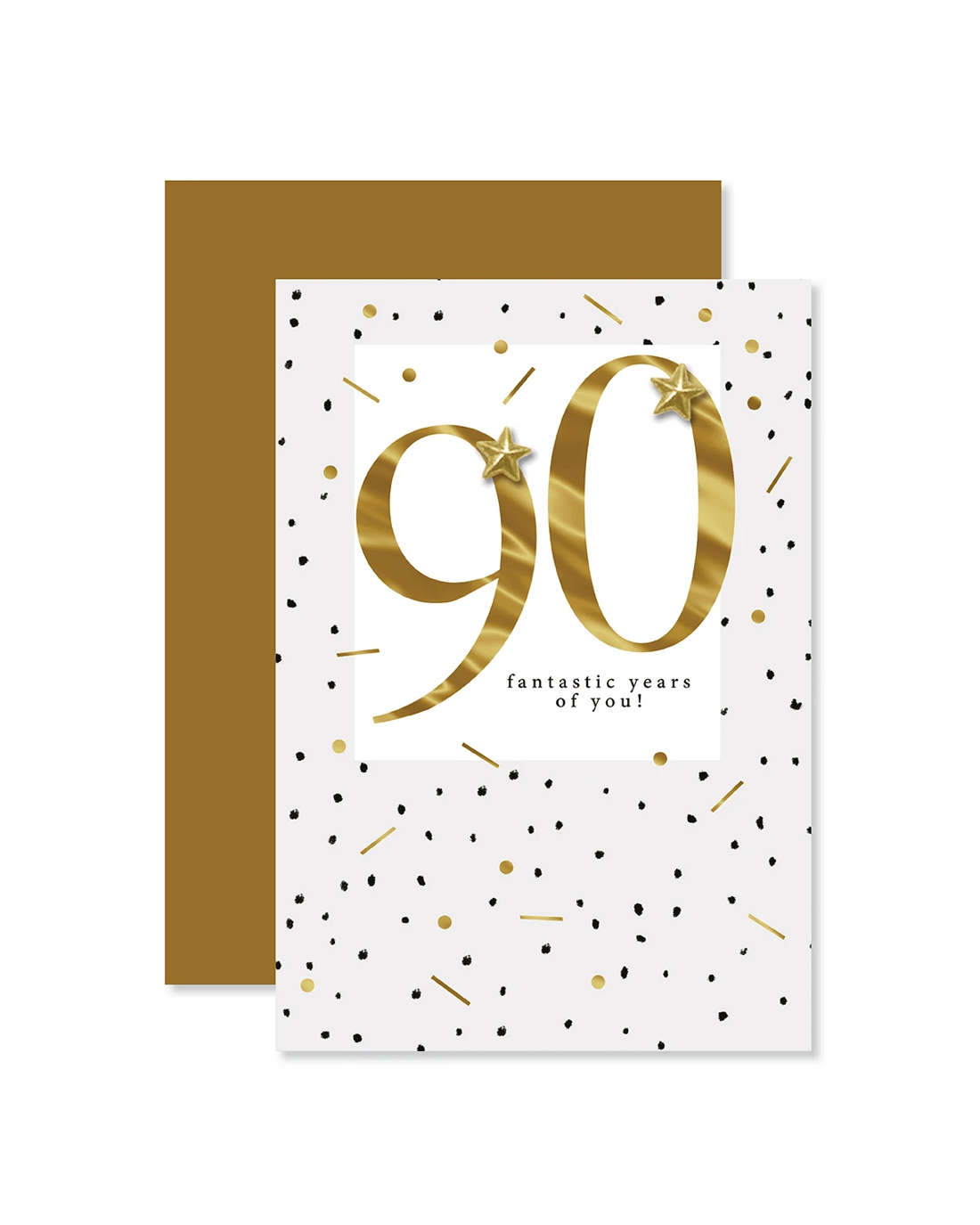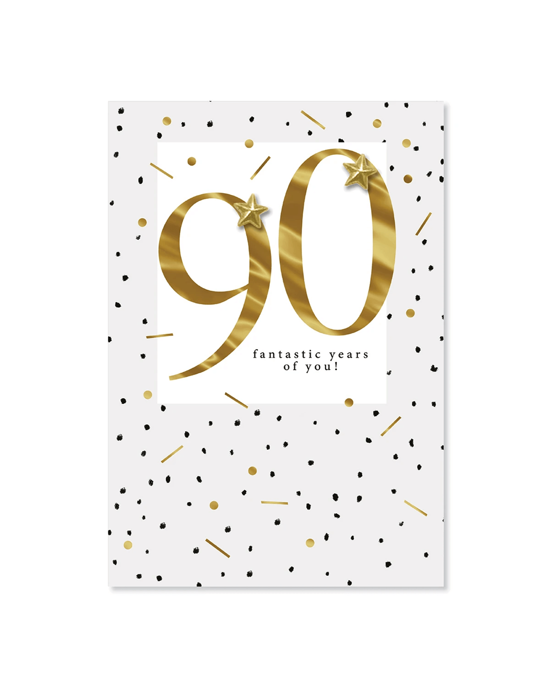 • Front of card features gold foil detailing, gold star attachment and the message '90 fantastic years of you!'