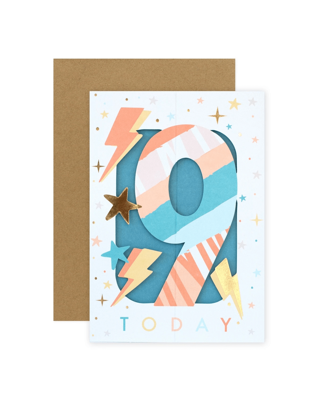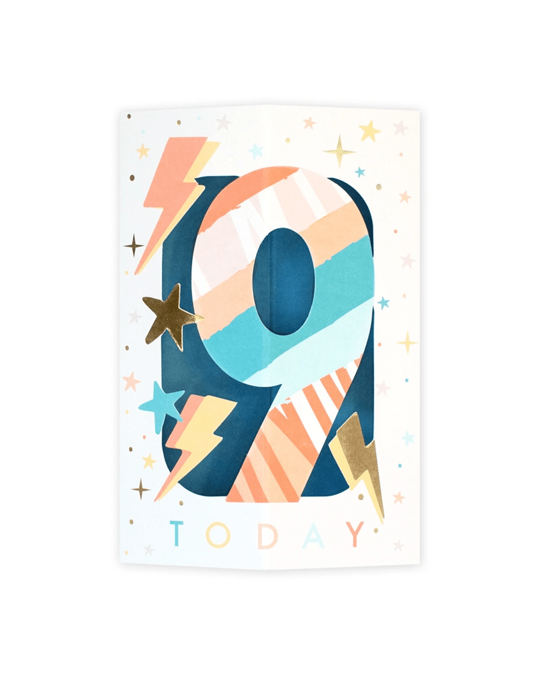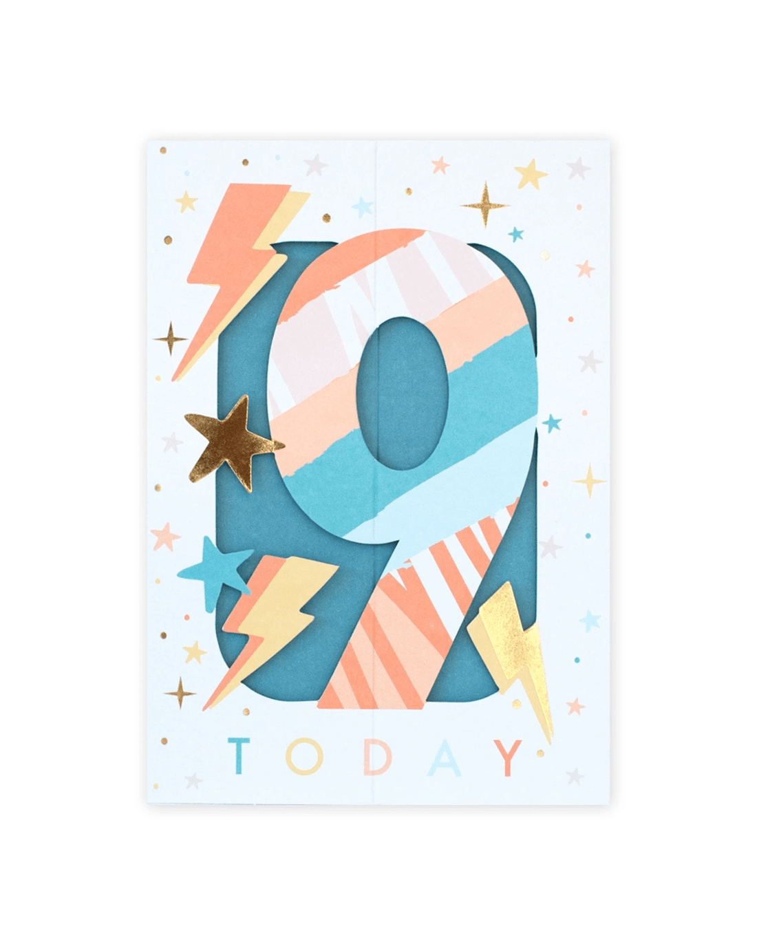 - The front of the card features gold foil highlights, laser cut detailing, illustrations of stars and lightening bolts and the message '9 TODAY'