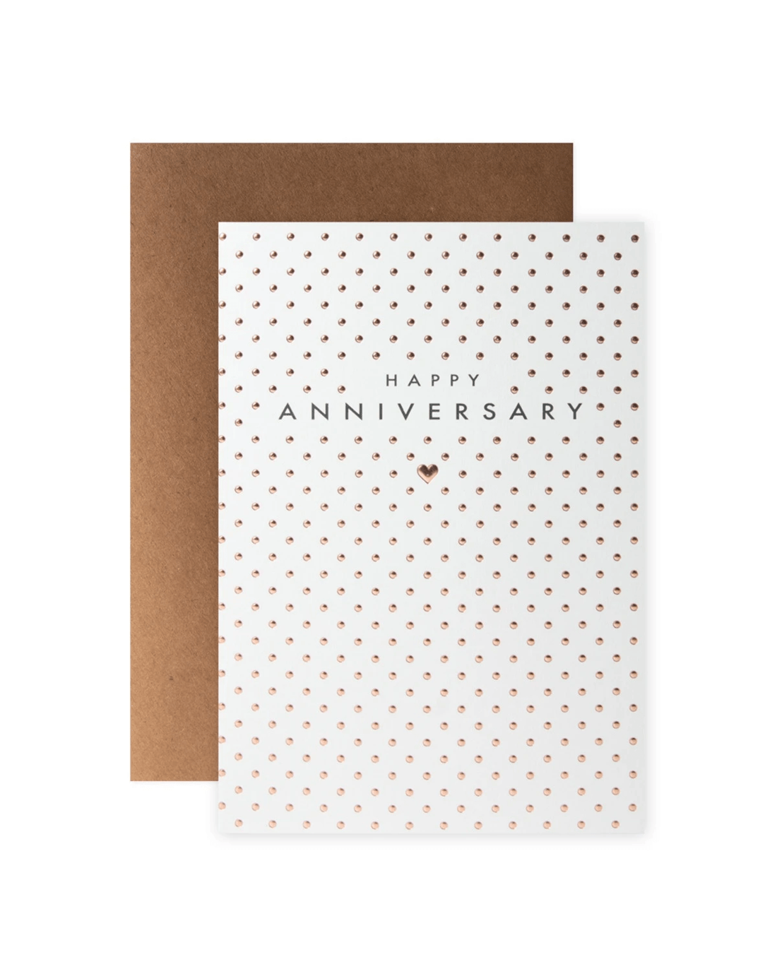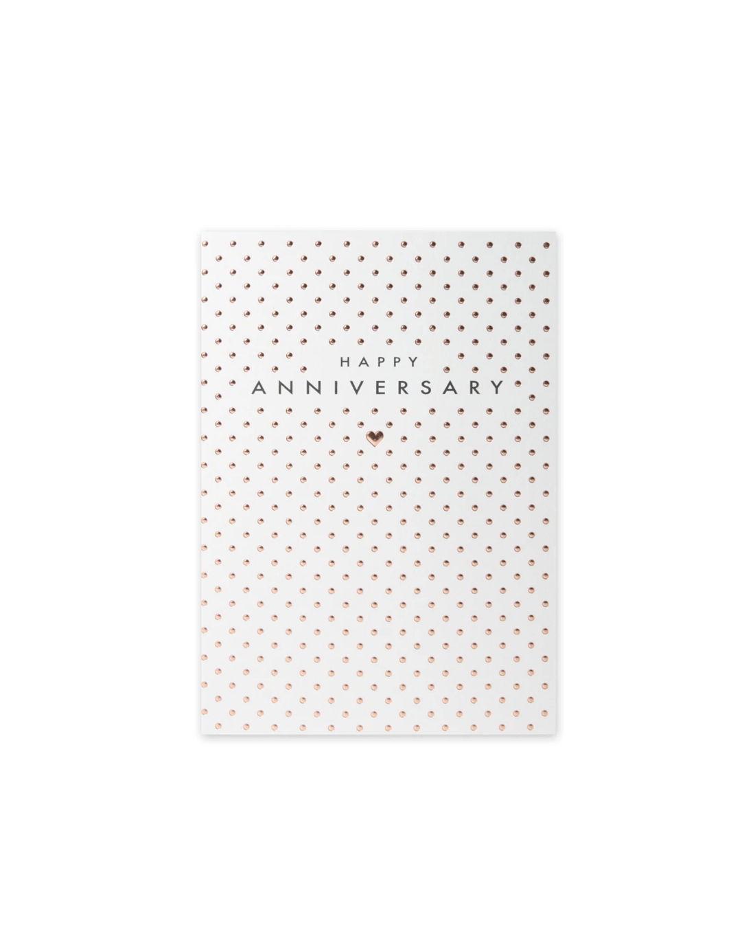 • The front of the card features rose gold foil highlights, embossed elements, illustrations of spots and a love heart and the message 'HAPPY ANNIVERSARY'