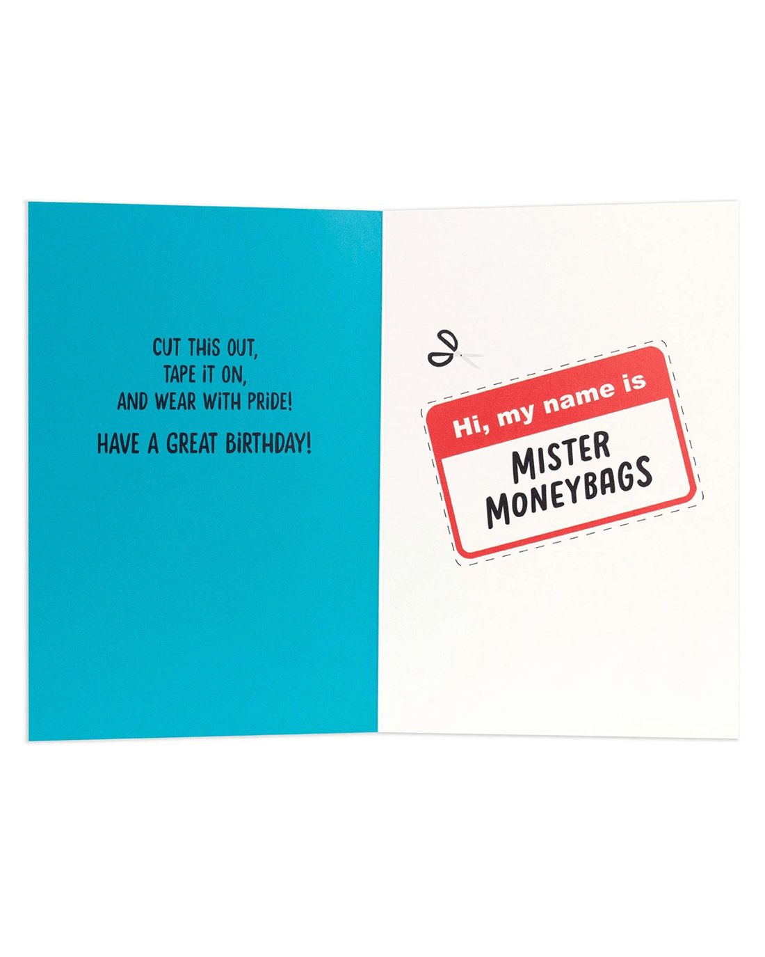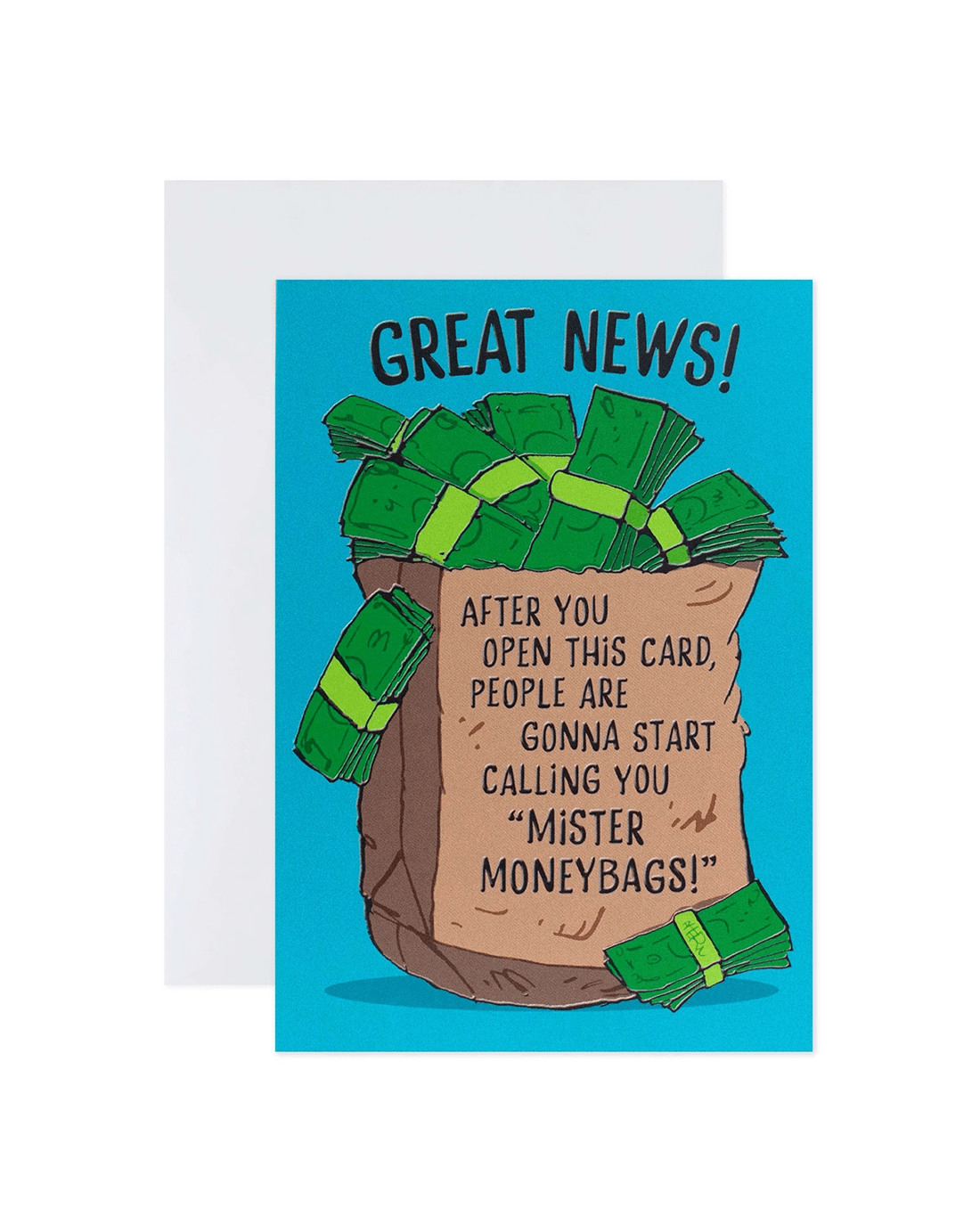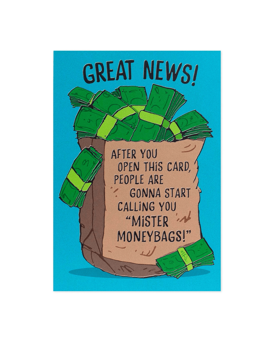 • Front of card features an illustration of a bag of money on a blue background with the message: 'Great News! After you open this card, people are gonna start calling you 'Mister Moneybags!'