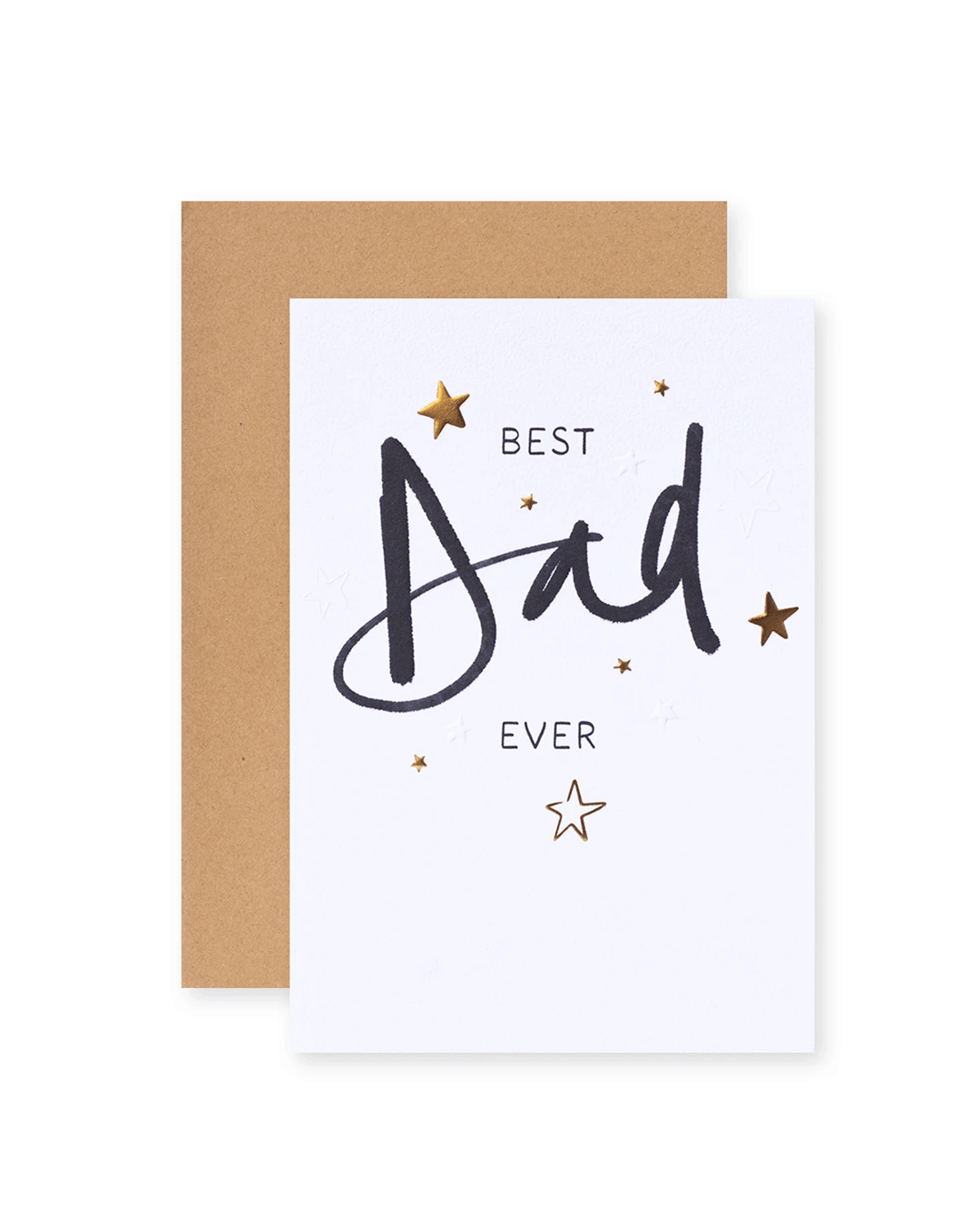 • Front of card features gold foil stars on a white textured stock with the message: Best Dad Ever