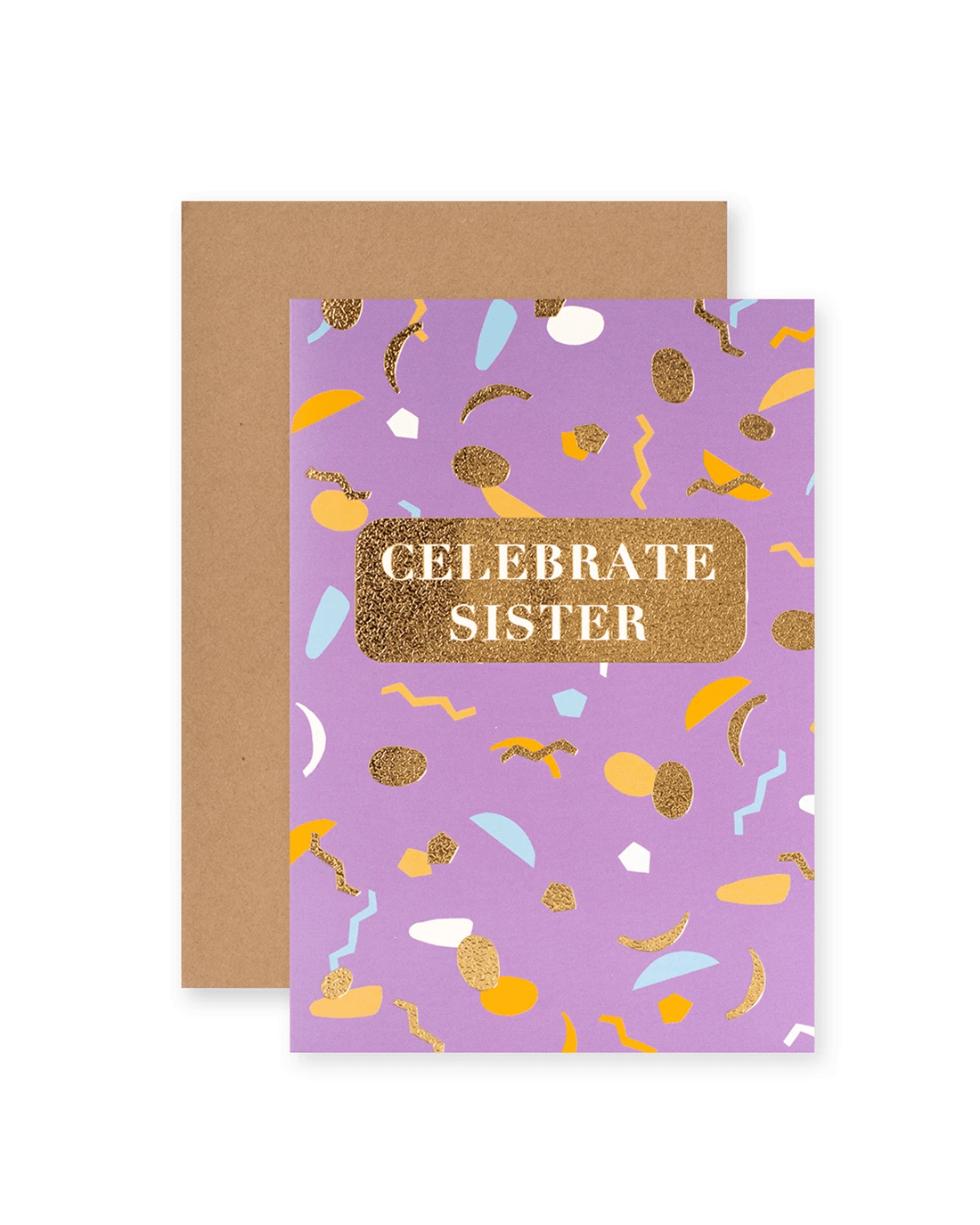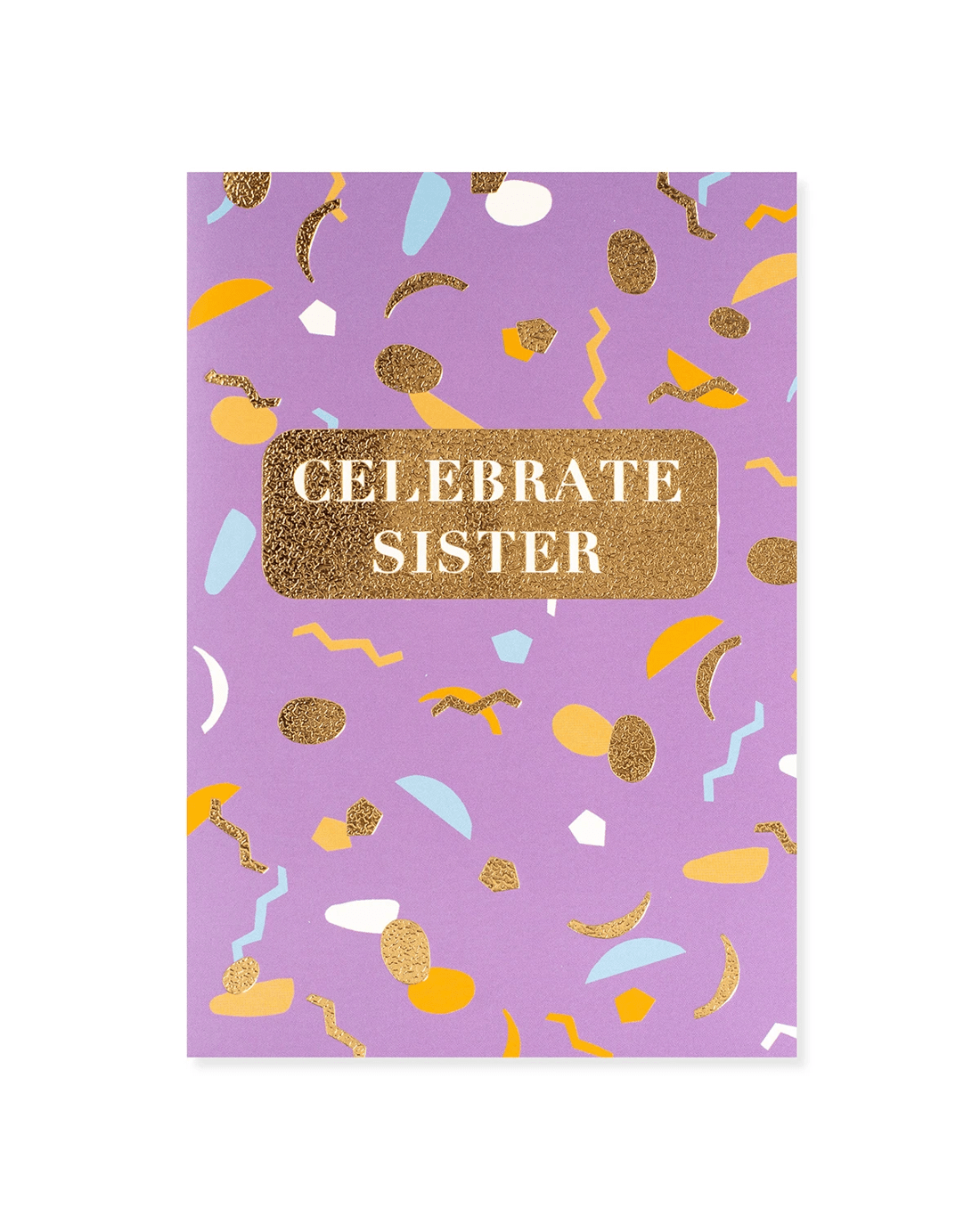 • Front of card features a textured gold foil and abstract shapes with the message: 'Celebrate Sister'