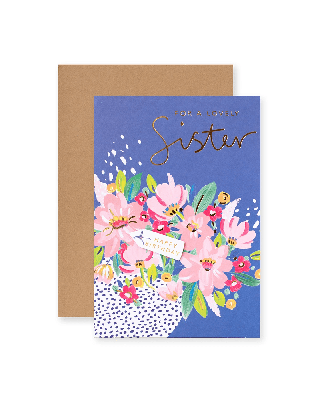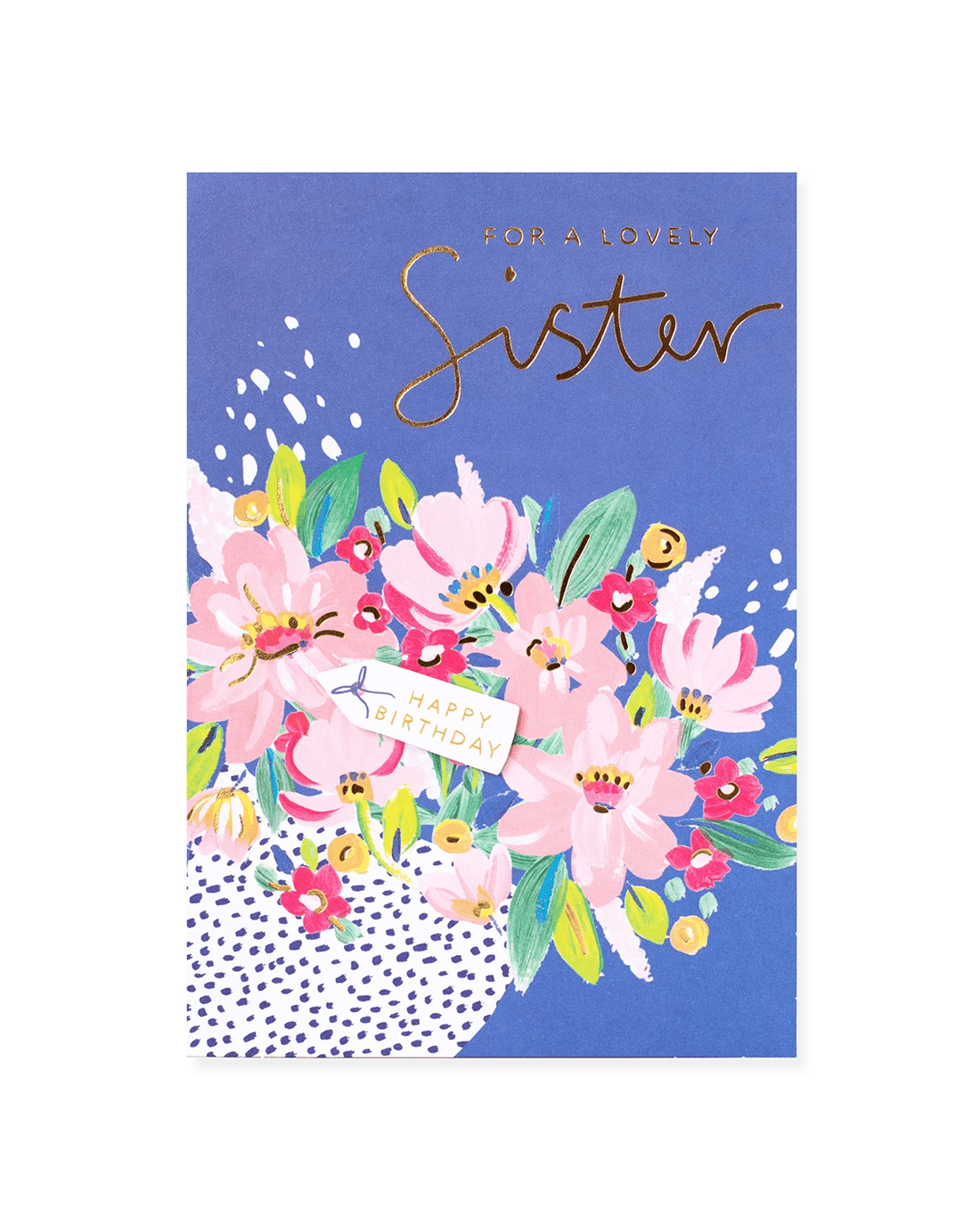• Front of card features a floral arrangement and gold foiled details with the message 'For a lovely Sister'