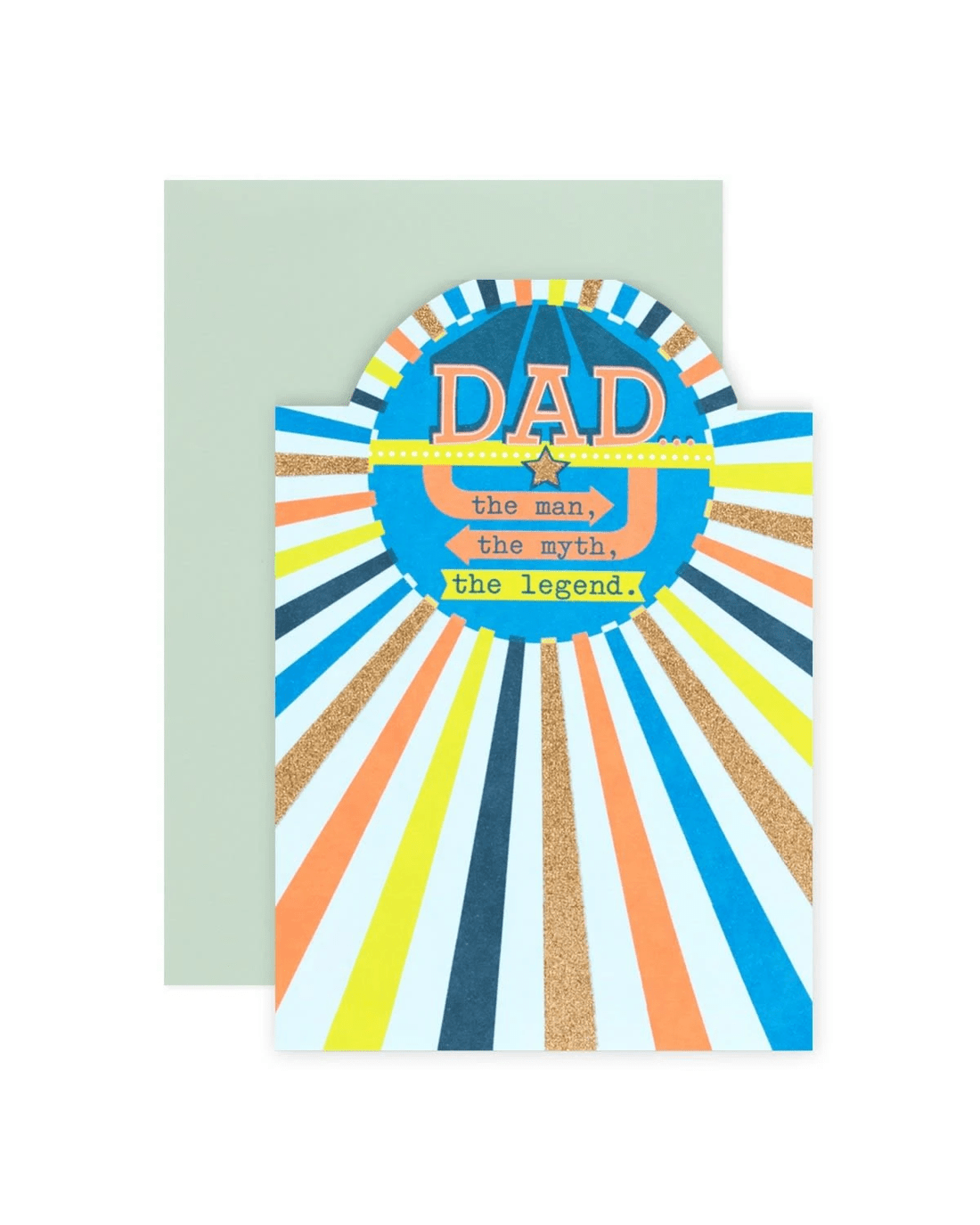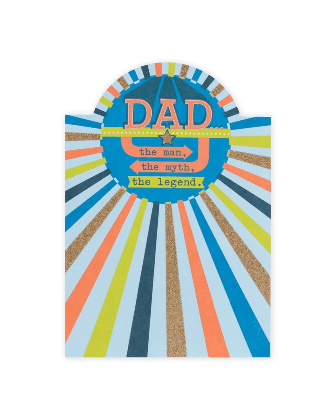 • The front features gold glitter highlight, illustrations of colourful stripes and the message 'DAD… the man, the myth, the legend.'