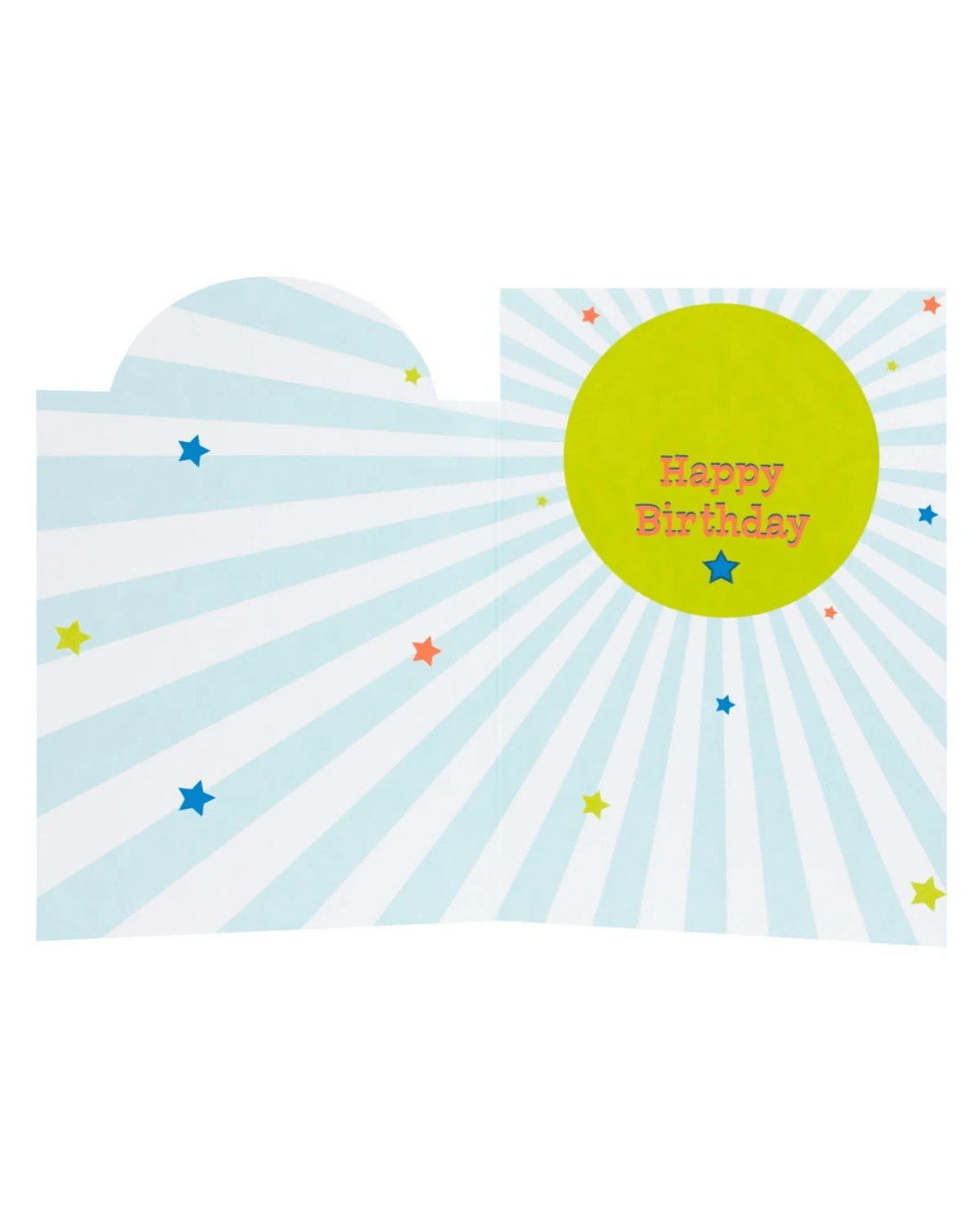 • The inside of the card has illustrations of stripes and colourful stars alongside the message 'Happy Birthday'