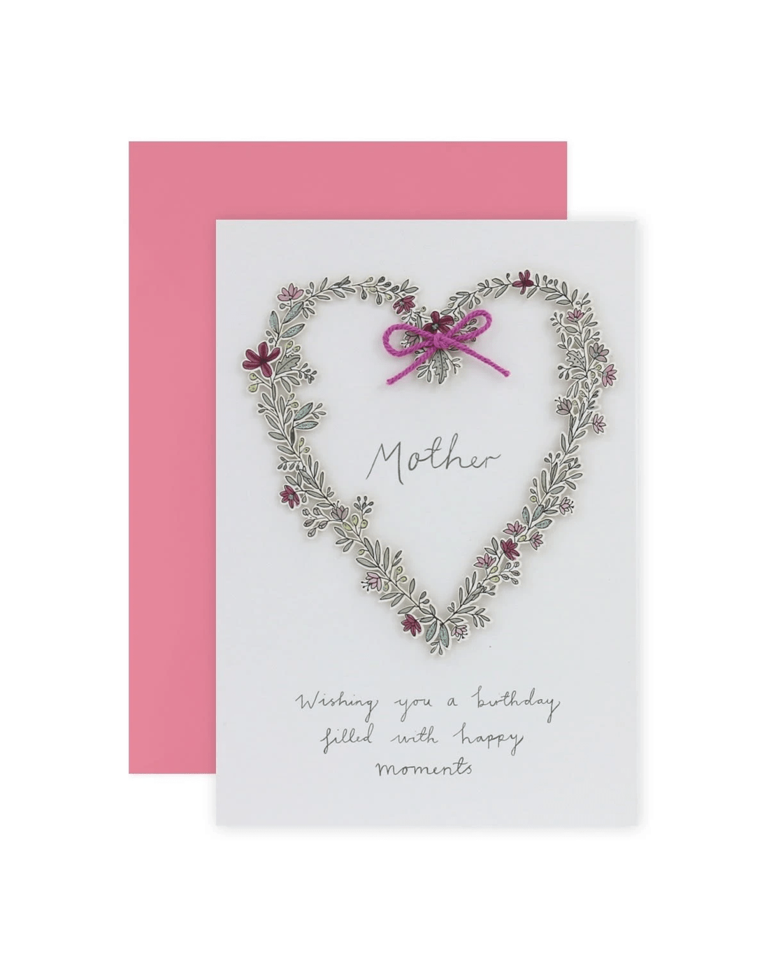 • The front of the card features glitter highlights, a 3D plaque, a purple string bow attachment, illustration of a heart shaped floral wreath and the message 'Mother Wishing you a birthday filled with happy moments'
