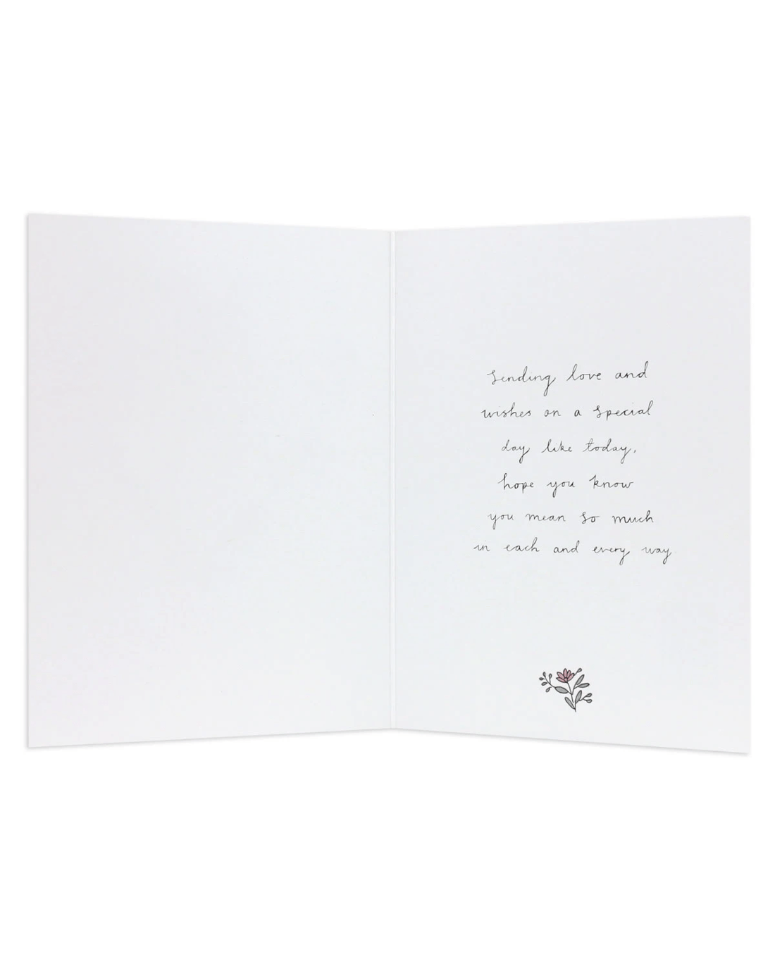 • The inside of the card features an illustration of a flower alongside the message 'Sending love and wishes on a special day like today, hope you know you mean so much in each and every way'