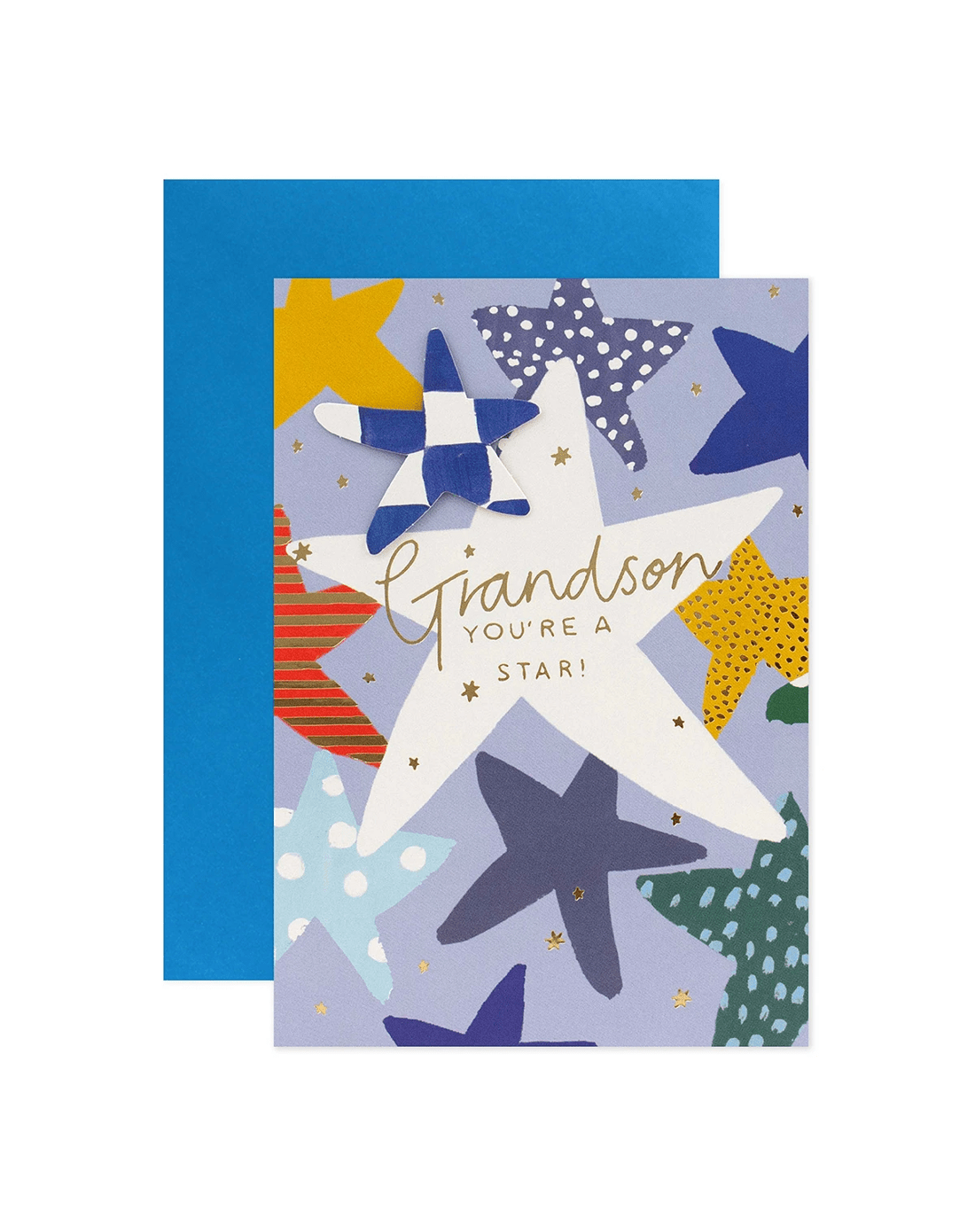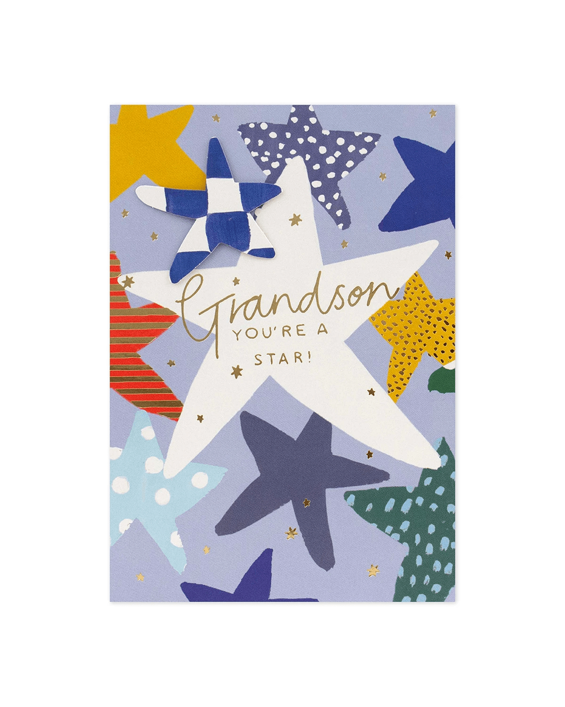 • Front of card features gold foil detailing and a painted star design with the message 'Grandson… You're a star!'