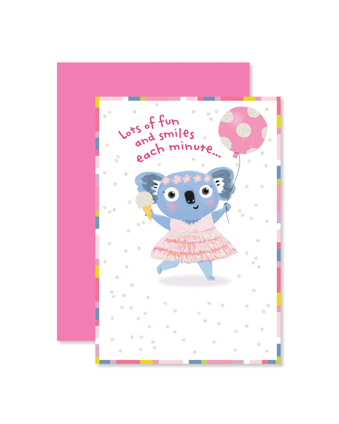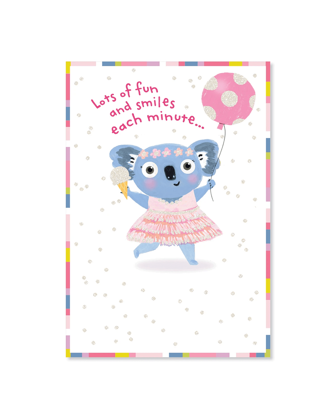 • Front of card features holographic silver foil detailing and an illustrative koala with the message: Lots of fun and smiles each minute…!