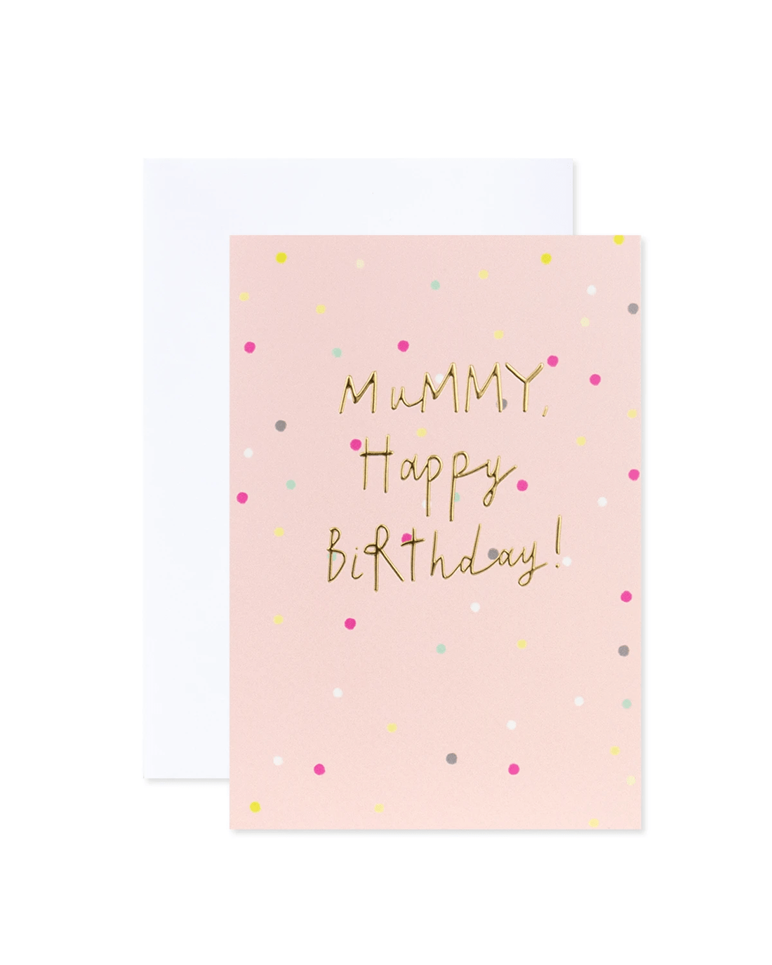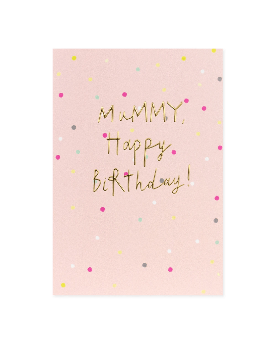 • Front of card features gold foil detailing and polka dots on a pale pink background with the message: 'Mummy, Happy Birthday'