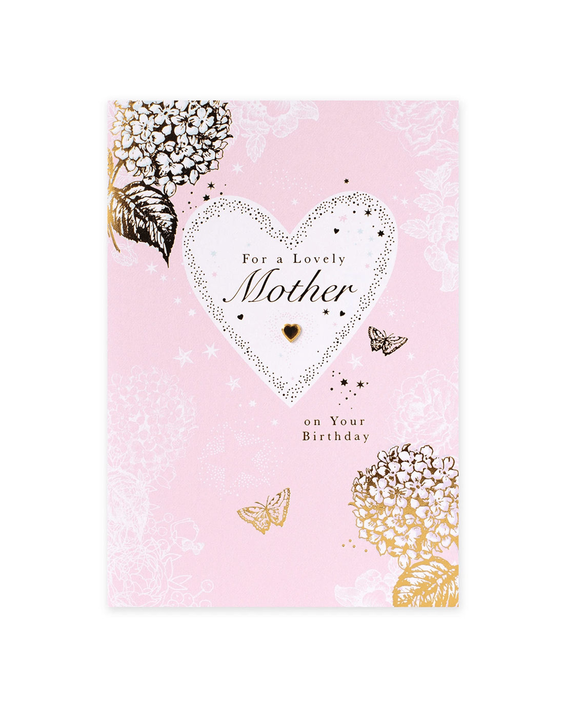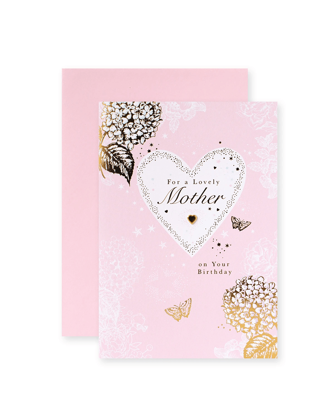 • Front of card features gold foil detailing and 3D dainty gold heart with the message: 'For a lovely Mother on your birthday'
