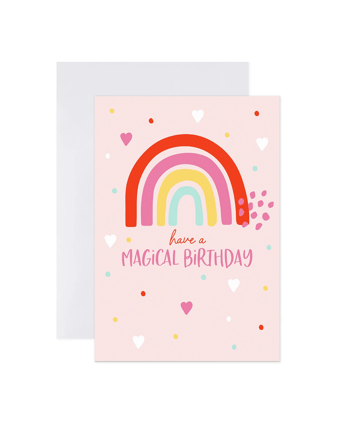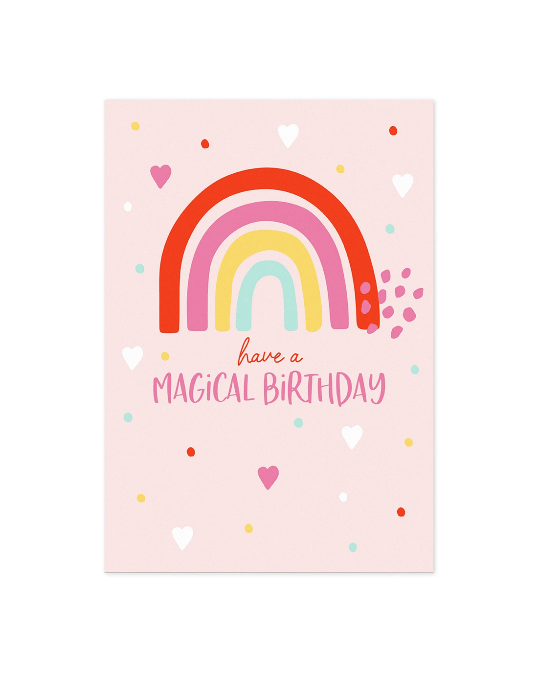• Front of card features a bright rainbow against a pink background with the message 'Have a magical birthday'