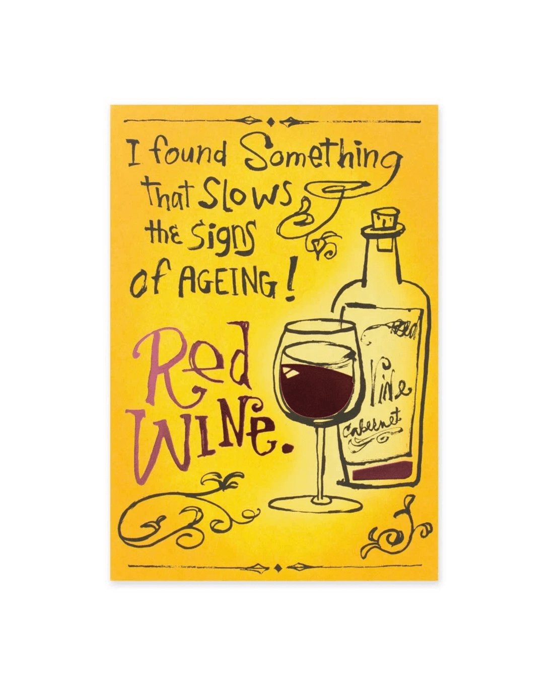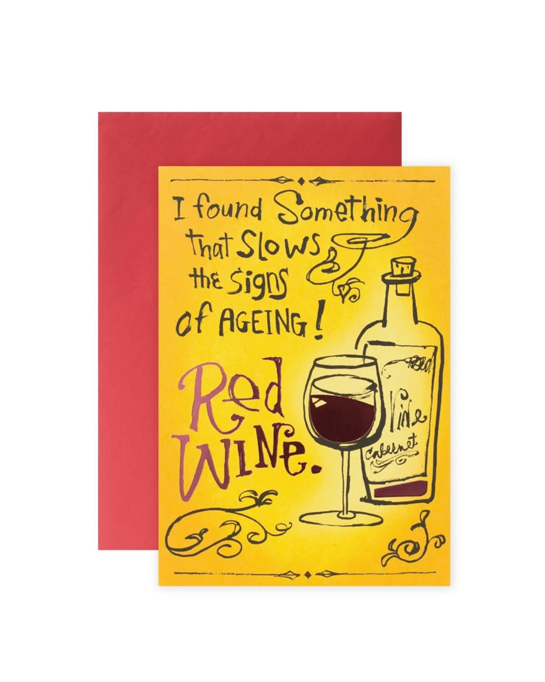 • The front of the card features an illustration of a bottle of wine and a glass of red wine with red foil highlights alongside the message 'I found something that slows down the signs of ageing! Red wine'