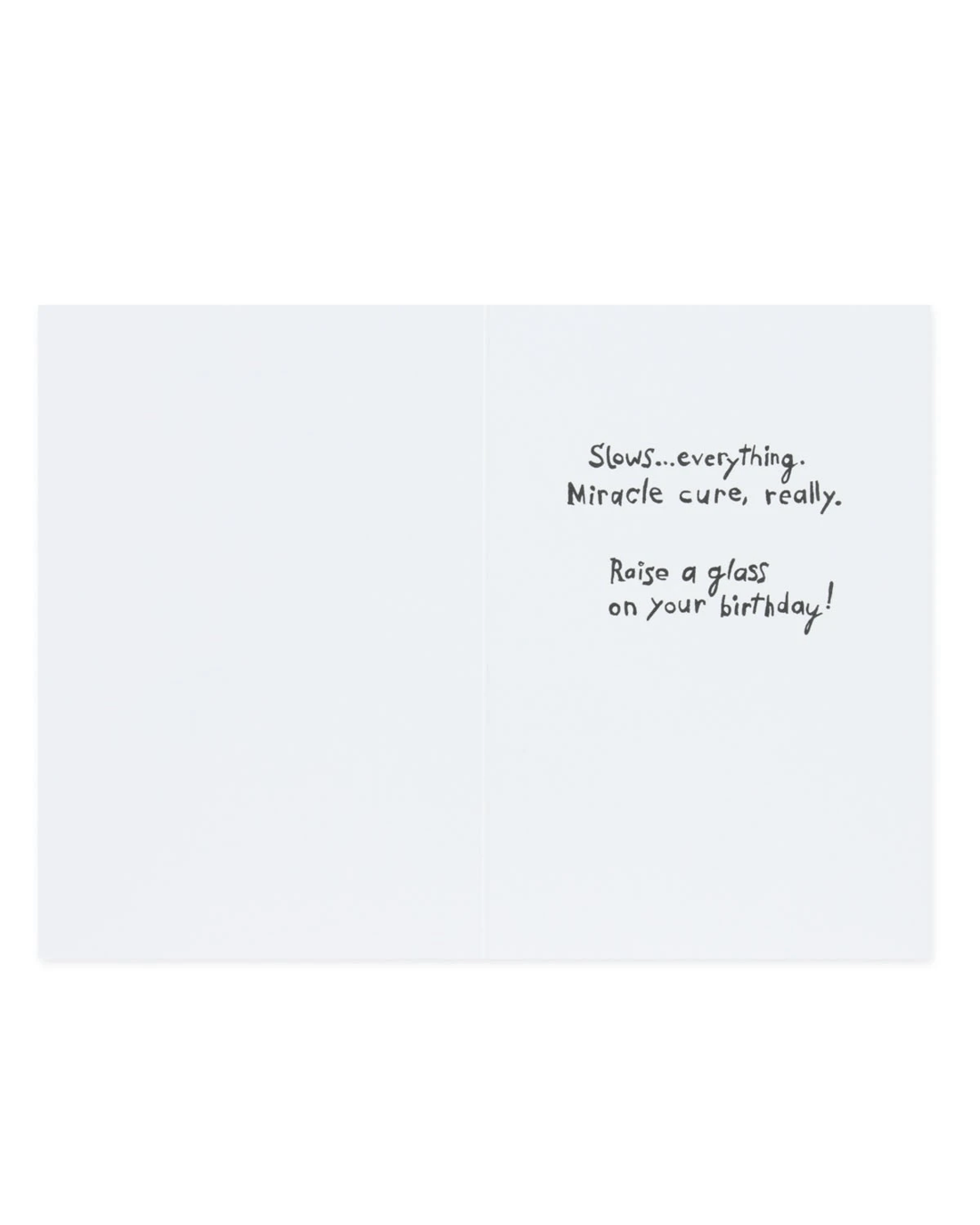 • The inside of the card features the message 'Slows..everything. Miracle cure, really. Raise a glass on your birthday!'