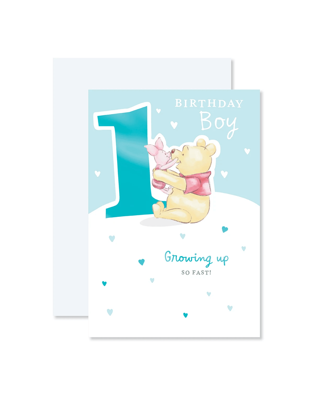 • Front of card features Winnie the Pooh, aqua foil detailing with the message 'Birthday Boy growing up so fast!'