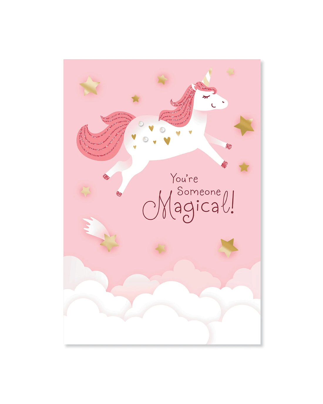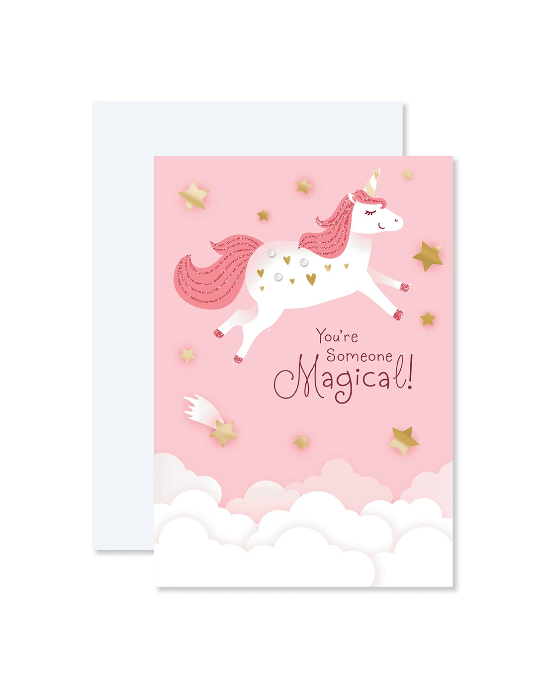 • Front of card features gold foil detailing and an illustrative unicorn with the message: 'You're someone magical!'