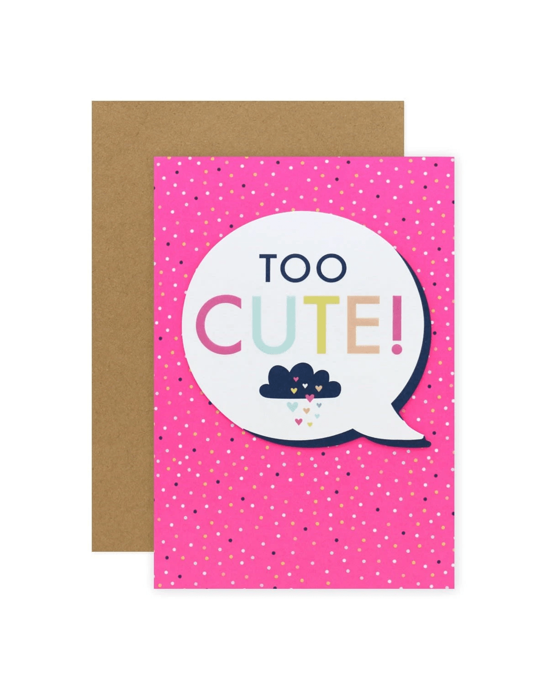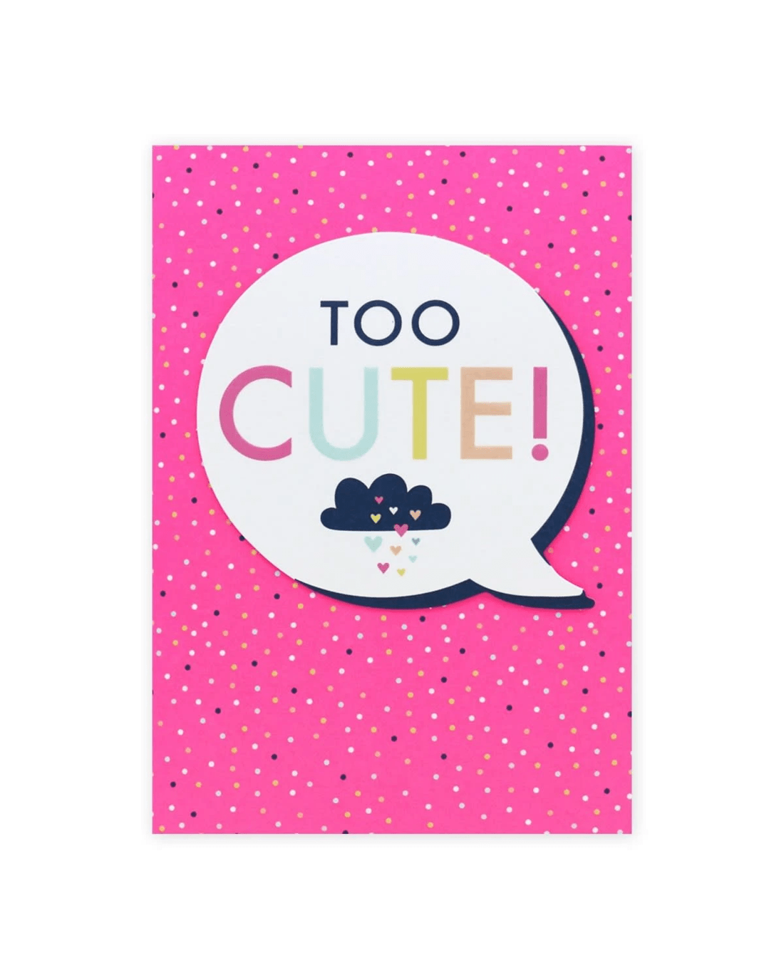 • The front of the card features pink neon ink, a 3D plaque attachment, embossed elements, an illustration of a cloud raining love hearts in a speech bubble and the message 'TOO CUTE!'