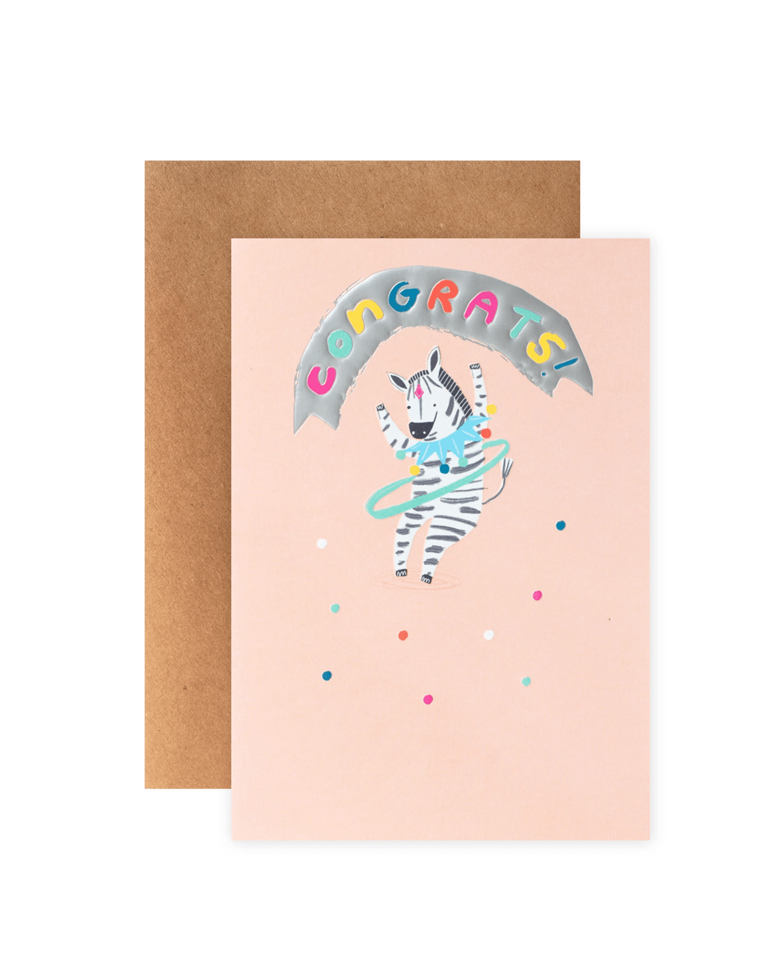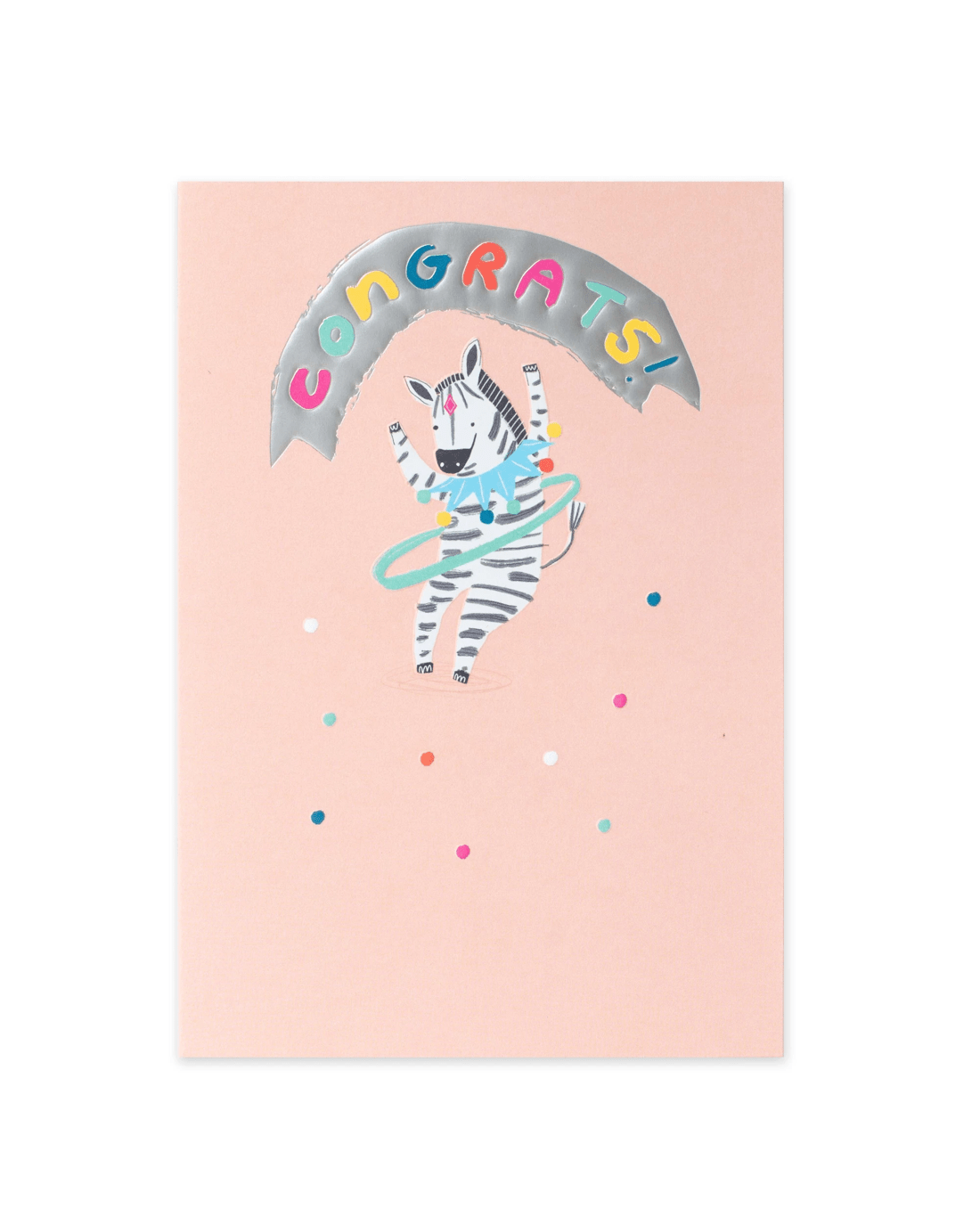 • The front of the card features embossed elements, silver foil highlights, an adorable illustration of a zebra hoola hooping surrounded by colourful confetti, and the message 'CONGRATS!'