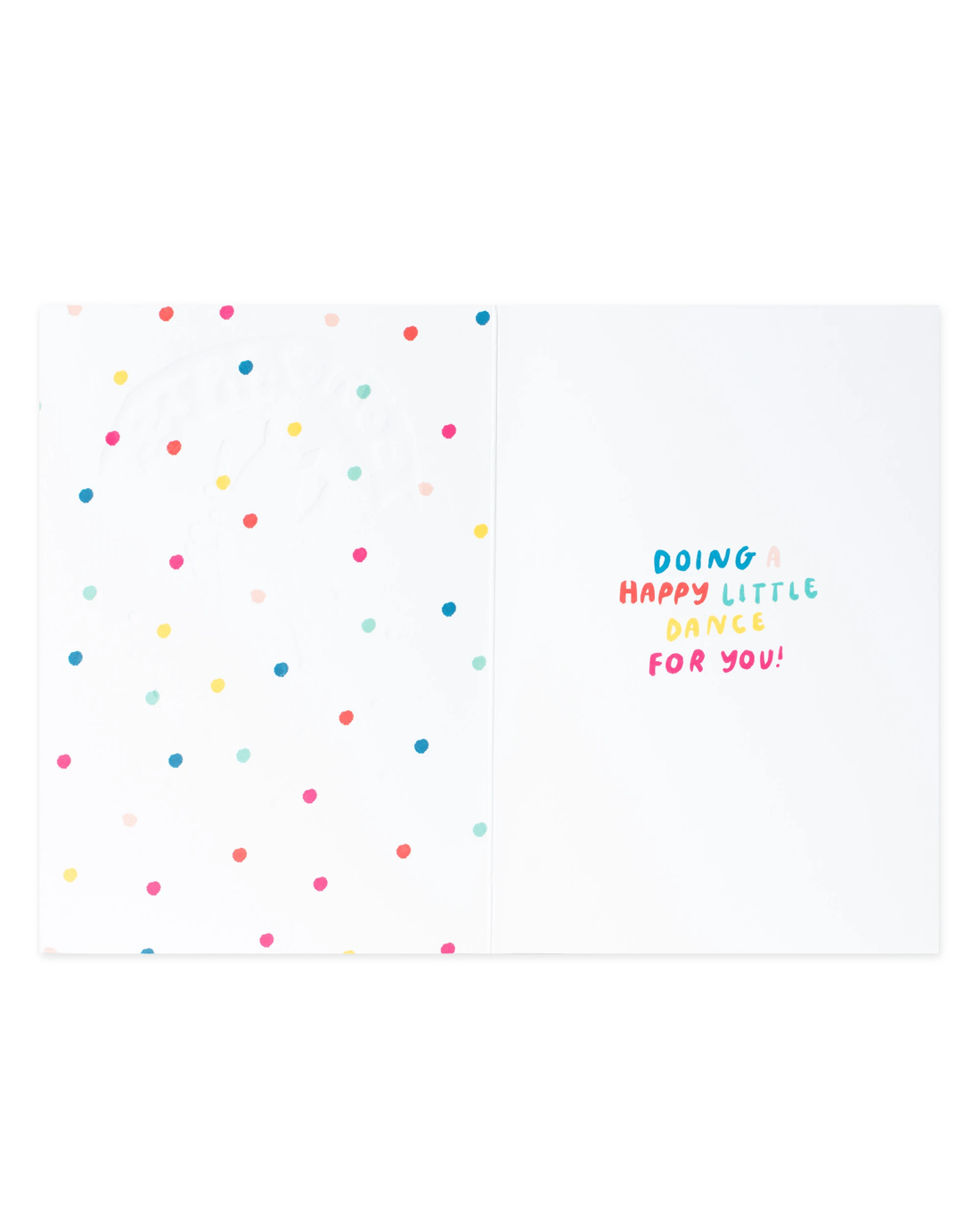 • The inside of the card features illustrations of colourful dots alongside the message 'DOING A HAPPY LITTLE DANCE FOR YOU!'
