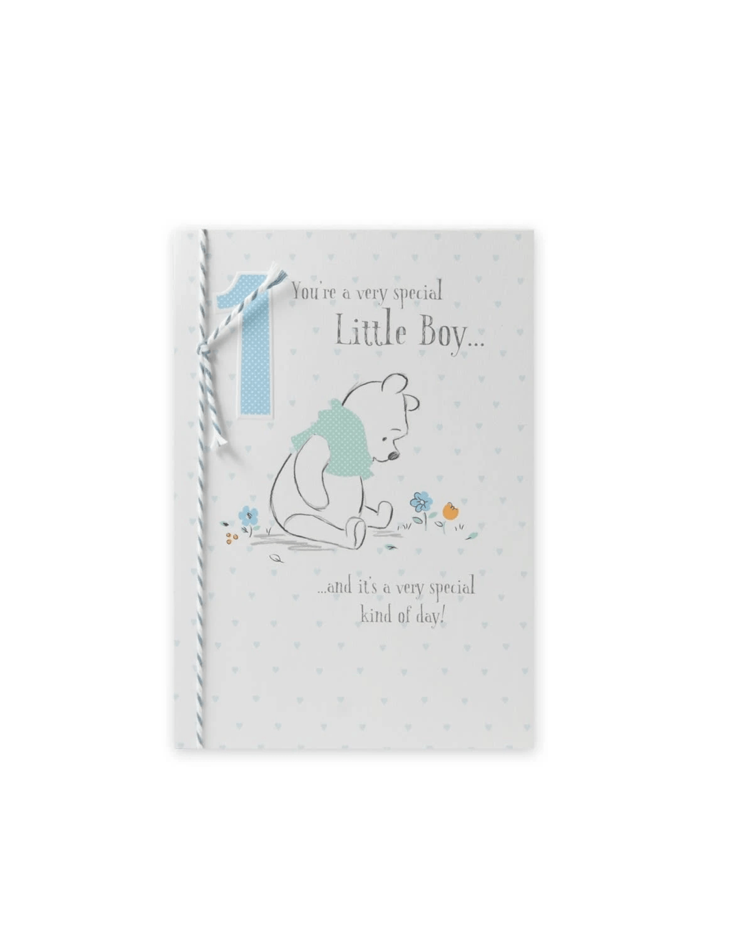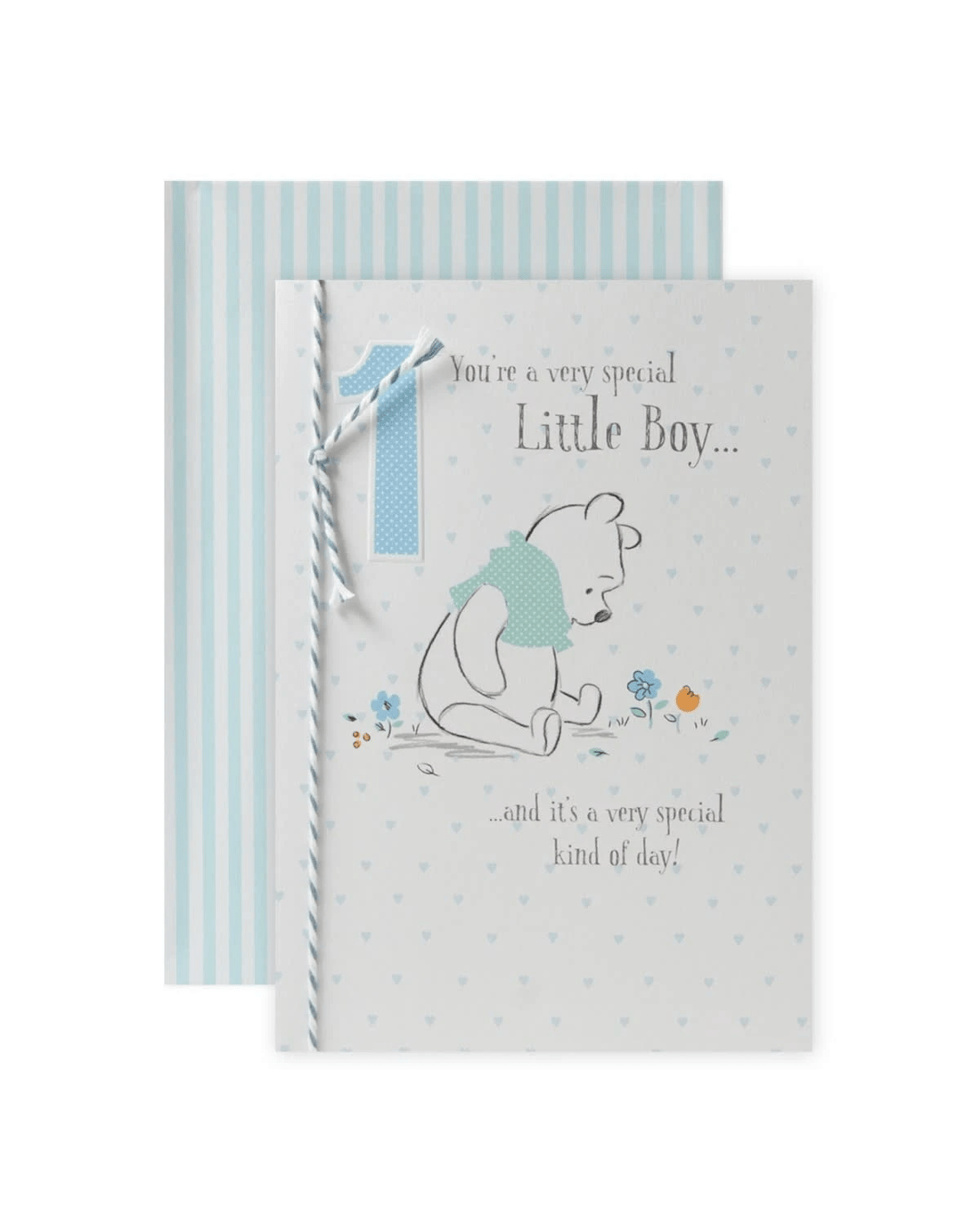 • The front of the birthday card features a sweet illustration of blue hearts and Winnie the Pooh sitting in a field of flowers, debossed details, blue and white tied string and the message: '1 You’re a very special Little Boy… …and it’s a very special kind of day!'