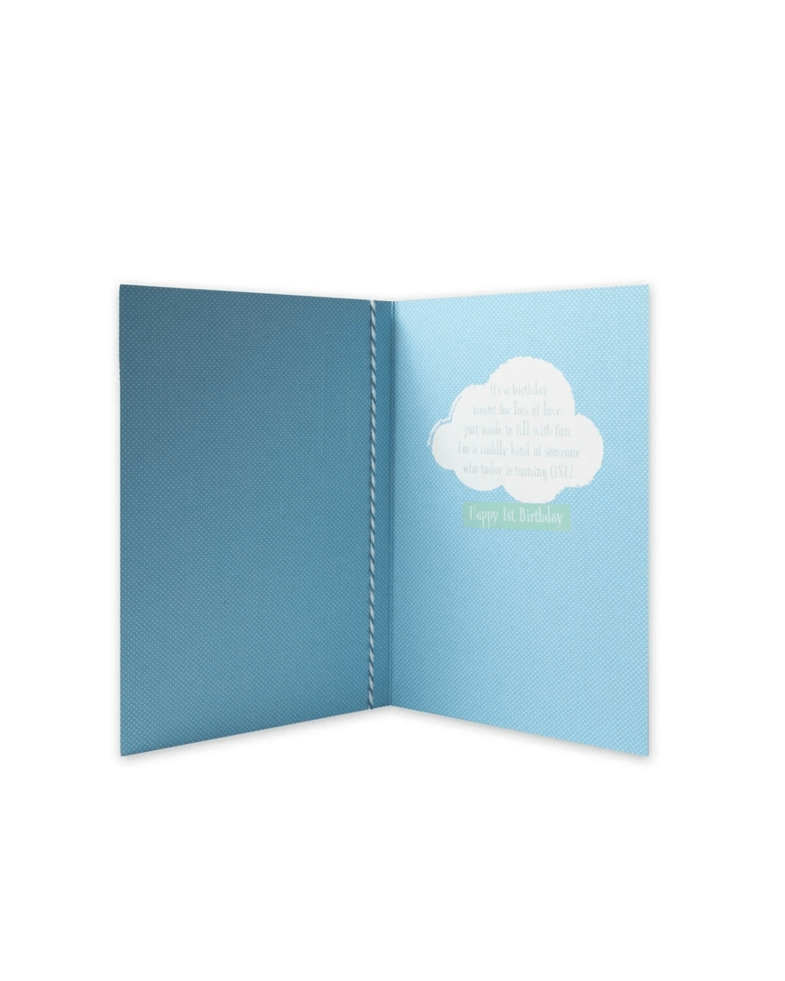 • The inside of the birthday card features a cloud illustration on a blue and white polka dot background with the message 'It's a birthday meant for lots of love, just made to fill with fun, for a cuddly kind of someone who today is turning ONE! Happy 1st Birthday'