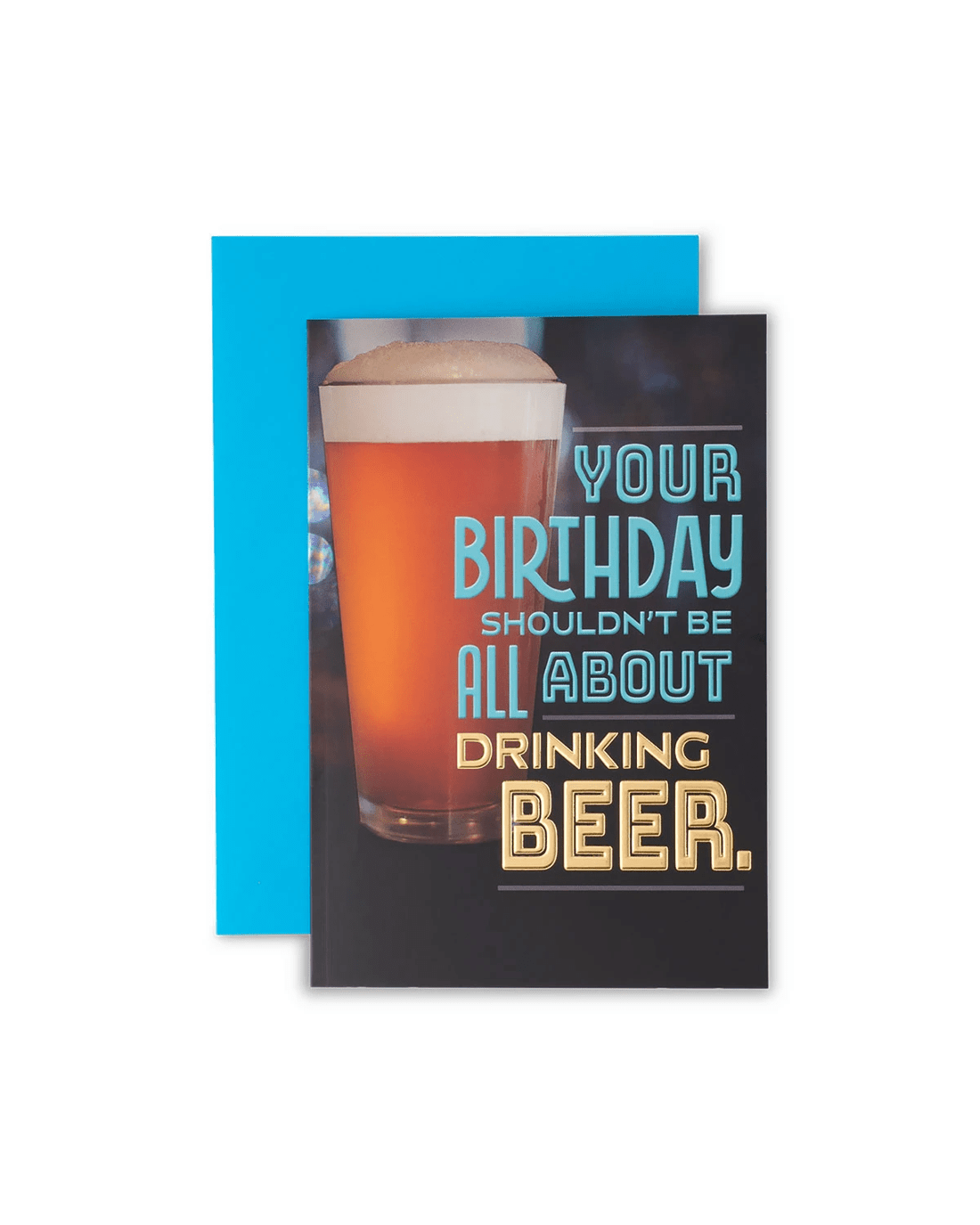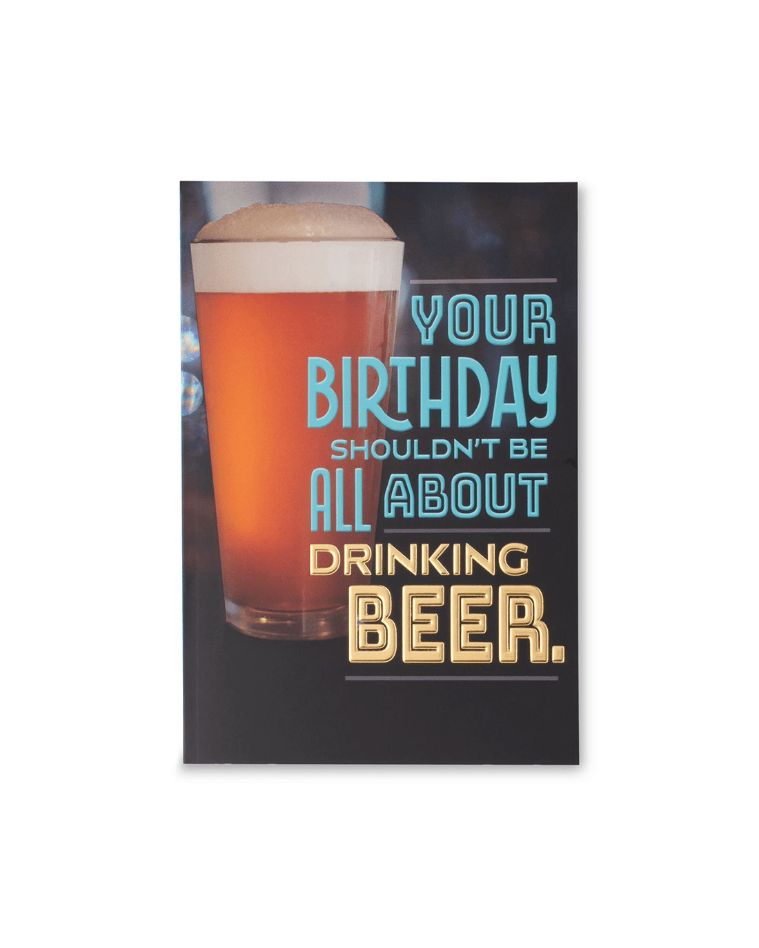 • Front of card features gold foil detailing and a photographic beer glass with the message: 'Your birthday shouldn't be all about drinking beer.'