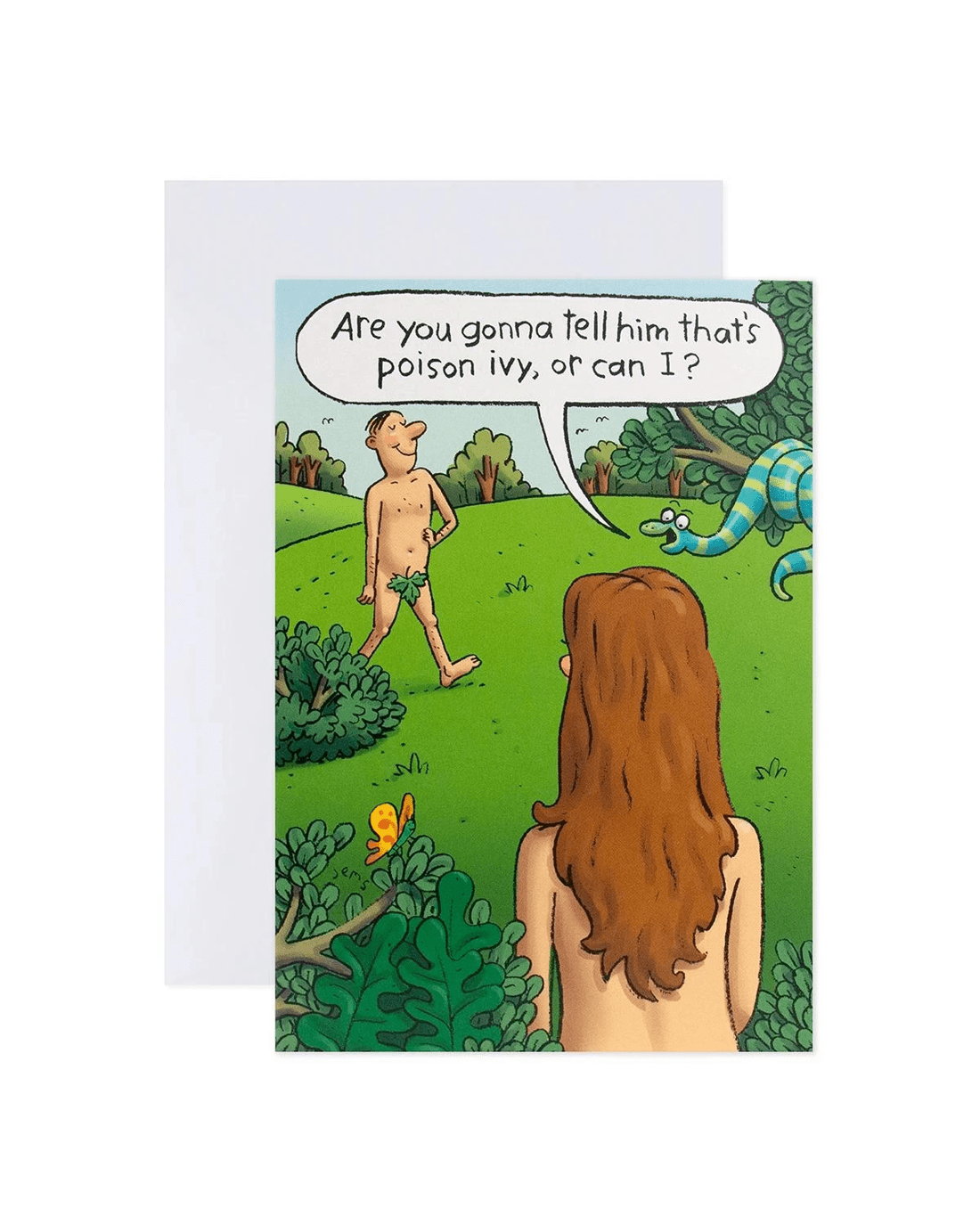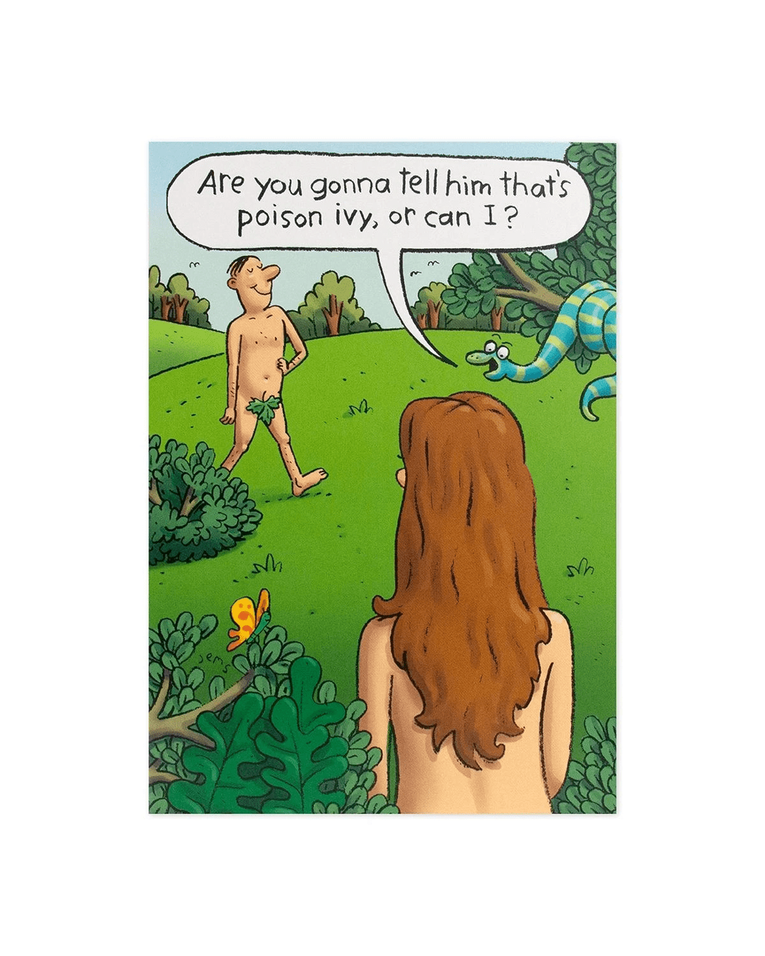 • Front of card features a fun 'Garden of Eden' illustration with the message: 'Are you gonna tell him that's poison ivy, or can I?