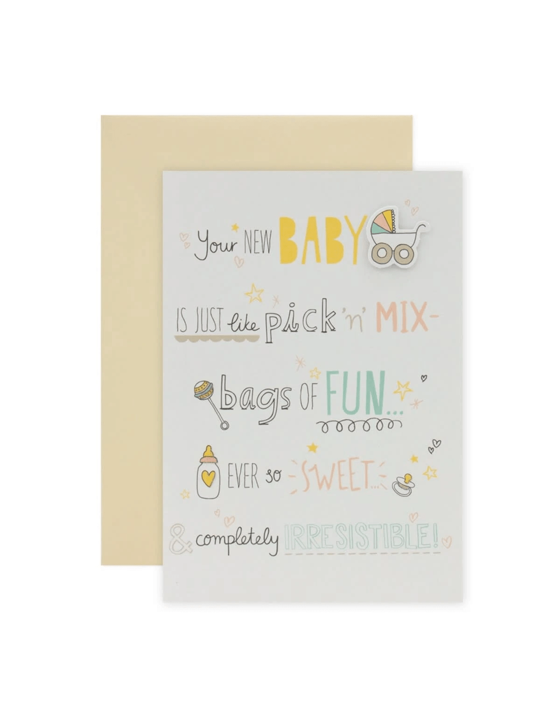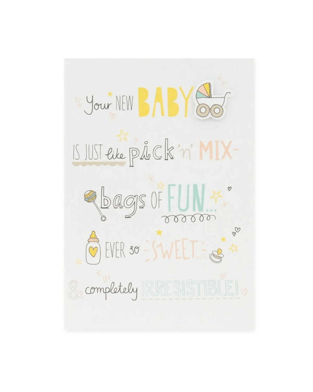 • The front of the card features glitter highlights, a 3D plaque attachment and illustrations of stars, love hearts, a bottle, a rattle, a pram, and a pacifier alongside the message 'Your NEW BABY IS JUST like pick 'n' MIX - bags of FUN... EVER so SWEET...; & completely IRRESISTIBLE!'