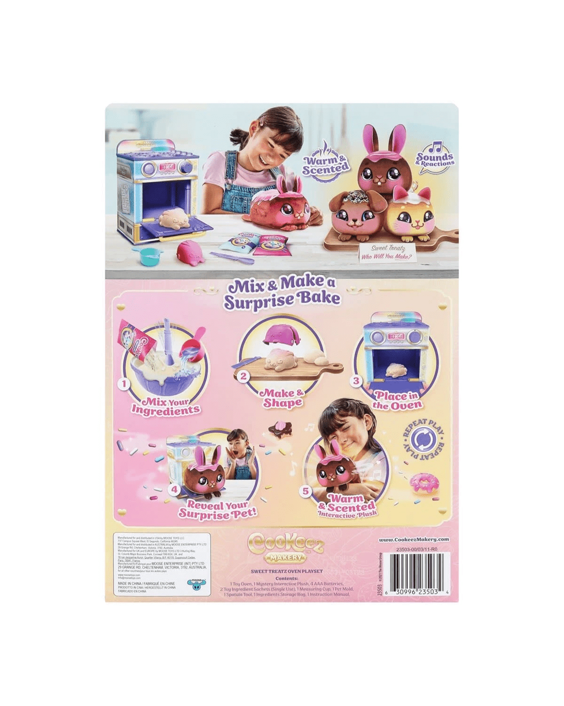 - Includes 1 x toy oven, 1 x mystery interactive plush, 2 x toy ingredient sachets (single use), 1 x measuring cup, 1 x dough mould, 1 x spatula tool, 1 x ingredients storage bag and 1 x instruction manual