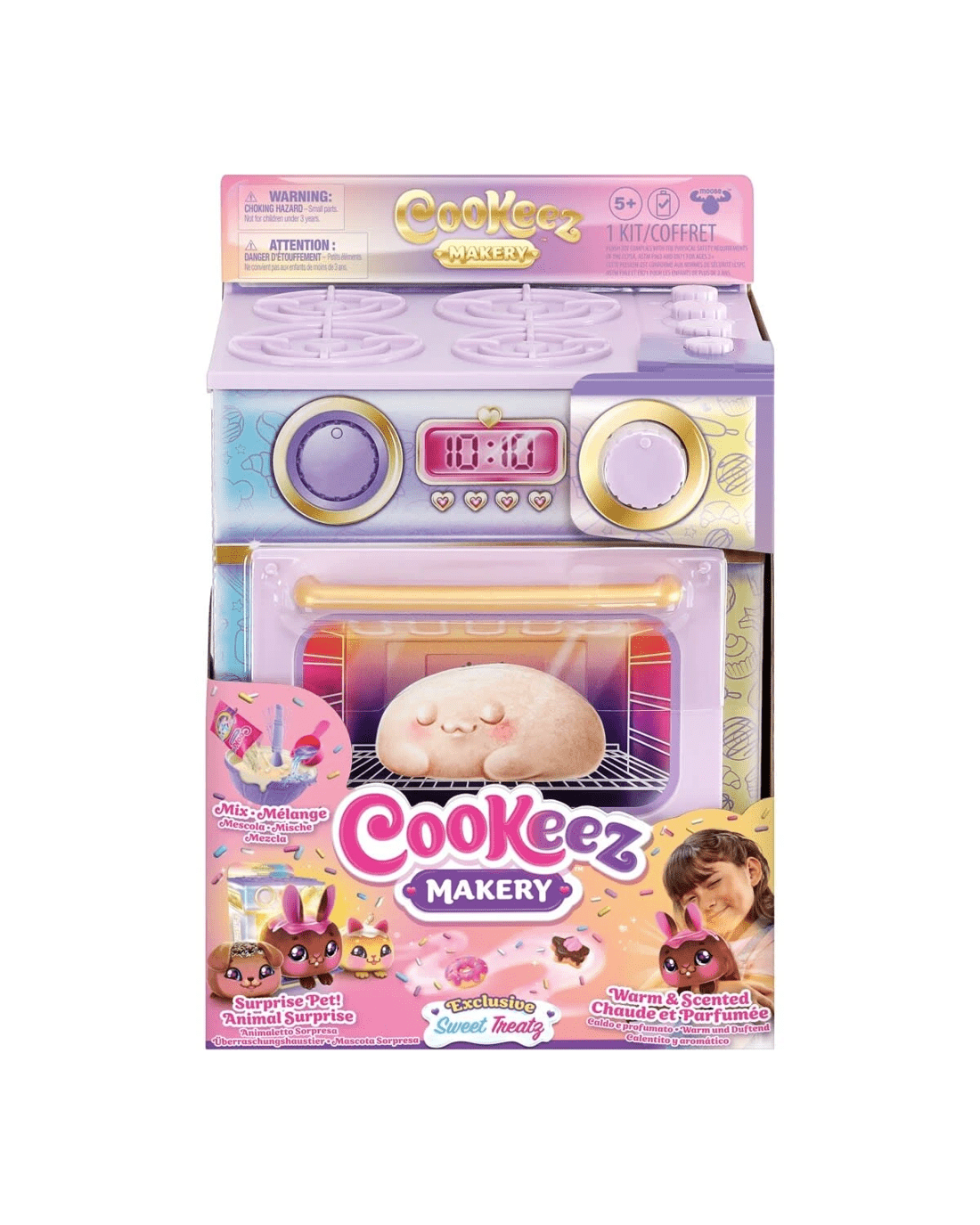 Cookeez Makery will amaze you and your child when they bake a surprise plush best friend! As they open the oven door they will discover their own warm and exclusive scented interactive plush friend in the shape of a yummy-smelling baked treat! The Cookeez Makery Exclusive Sweet Treatz Oven comes with everything children need to mix and make a Surprise Bake! When they first open the oven door they will find a recipe box and a recipe card that tells them which friend they will bake. There's a chance of making a puppy, kitten or bunny! Let's get cooking! First, they mix the ingredients to create a dough ball. Then using the dough mould and included tools they can add adorable features such as eyes, mouth, paws and ears. It's so easy! Then pop it in the oven and shut the door. In 90 seconds, kids will hear a 'ding'. It's time to open the oven and meet a new friend. Wow! A warm and deliciously sweet-scented plush toy that's interactive to play with! Their new baked friend even makes lovable sounds when your child squeezes and loves it! With the Cookeez Makery Oven baking friends is easy! Which Sweet Treatz will they make? There are three to create and collect - Sour Puss, Frosty Fido and Raspbunny Glaze! Children can repeat the process again and again to wow family and friends! You will 'Bake their day' when you give your child a Cookeez Makery - Exclusive Sweet Treatz Oven!