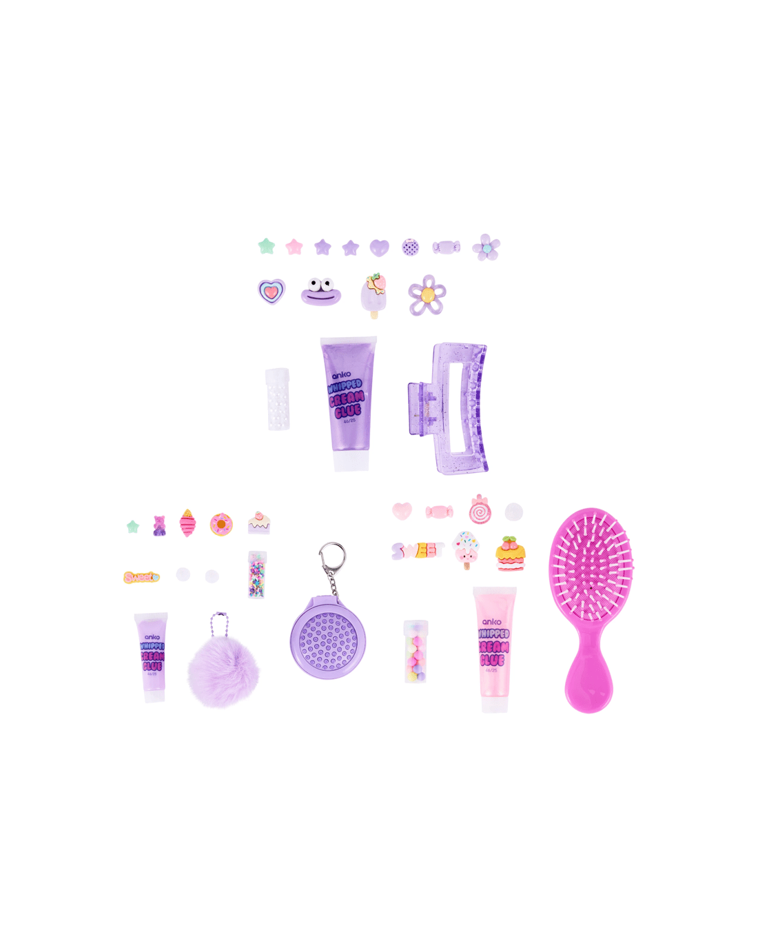 - Mirror brush decor kit: 1 x mirror and brush keychain, 1 x tube of clay sprinkles and 1 x whipped cream glue, 1 x nozzle, 1 x pom pom and 6 x charms
