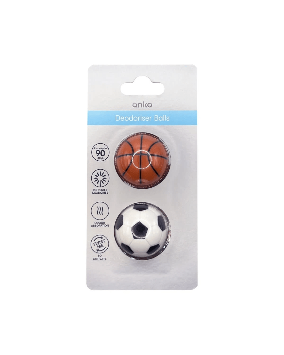 These deodoriser balls help keep your shoes, gym bags, gear bags, lockers and closets smelling fresh. Sized and shaped to fit in small spaces where other fresheners won't fit, deodoriser balls are an essential foot care accessory. The balls feature quick-twist action, which opens the vents to release a specially formulated fresh and clean scent. Preserve the freshness and life of your deodoriser balls by twisting them to close the vents when not in use. The scent lasts up to ninety days depending on use. Deodoriser balls fit in all shoes, from kids through adults and effectively freshen up athletic shoes, everyday footwear, gym bags and more.
