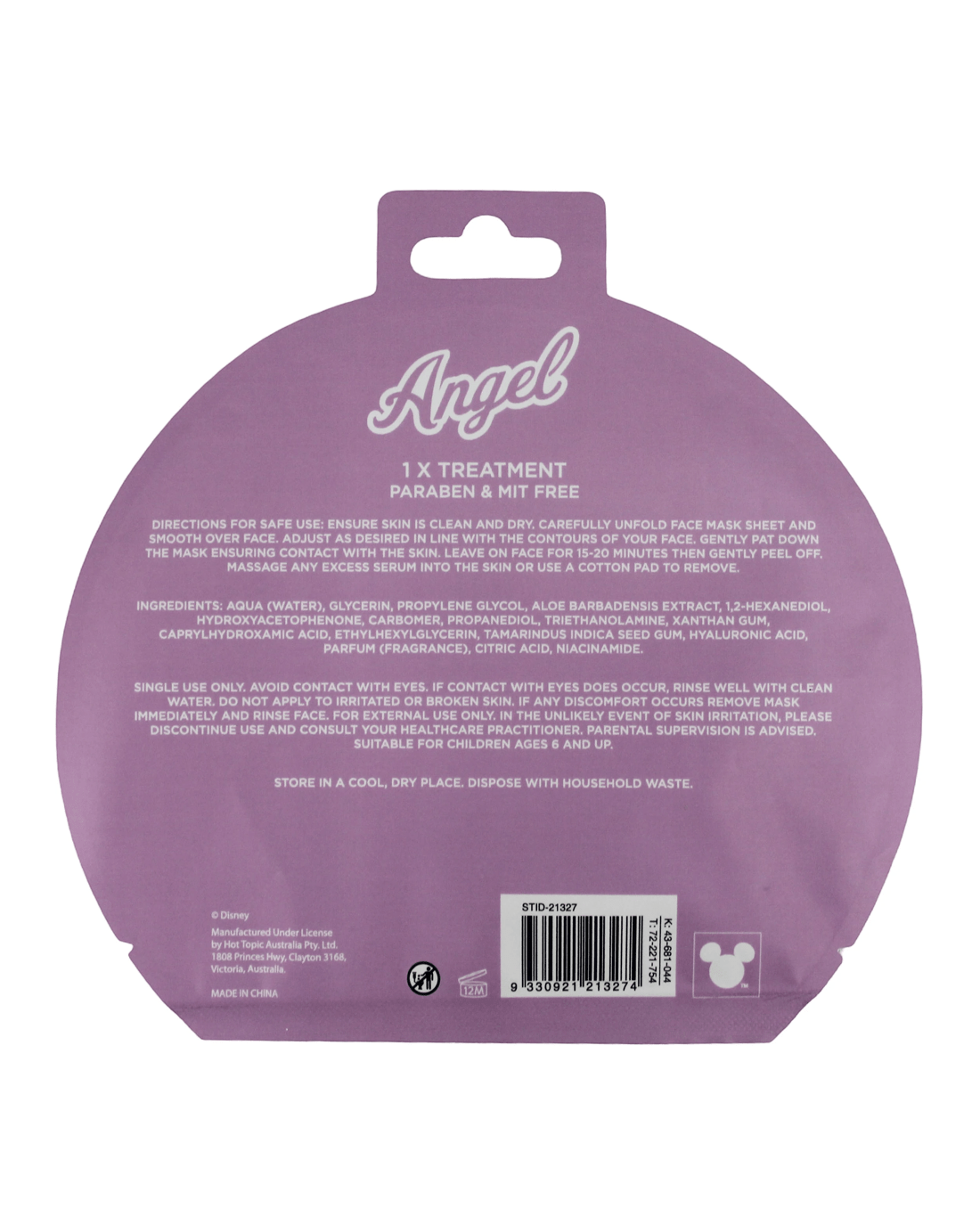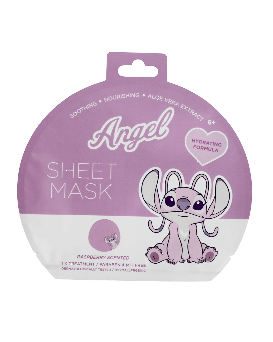 Disney Angel face sheet mask is a hydrating facial mask infused with soothing aloe vera extract. Lightly blueberry scented, it helps nourish and refresh the skin while delivering lasting moisture. Dermatologically tested and paraben free, this single use mask is ideal for relaxing self care moments and everyday skincare routines.