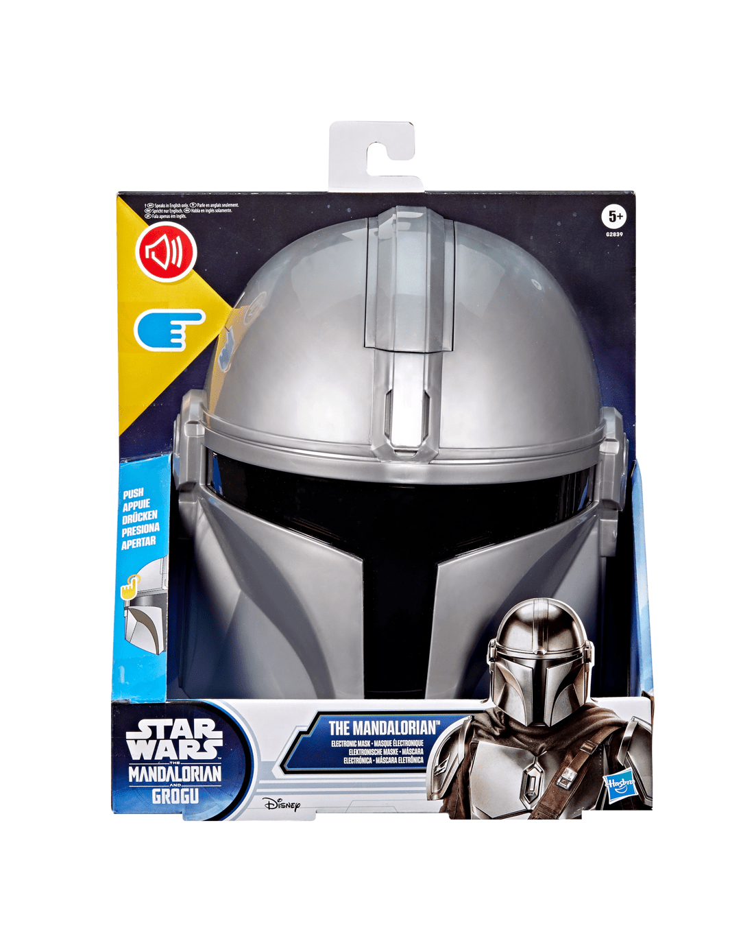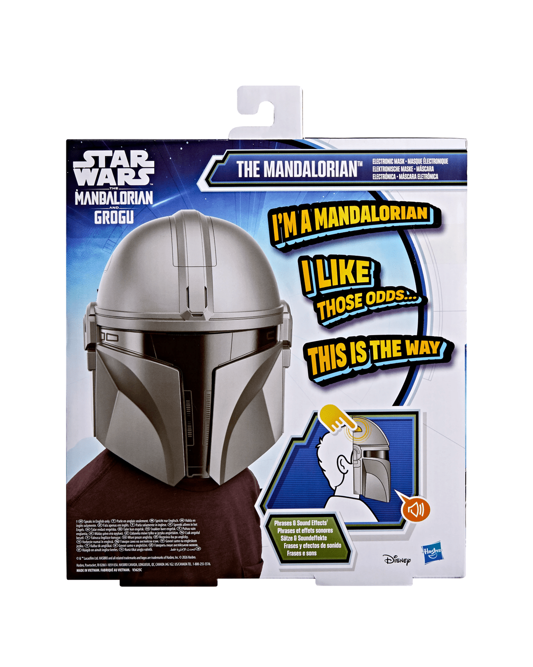 - Sound effects and phrases: Push the button on the side of the mask for sound effects and phrases like, 'I'm a Mandalorian' and 'I like those odds' (Speaks in English only)