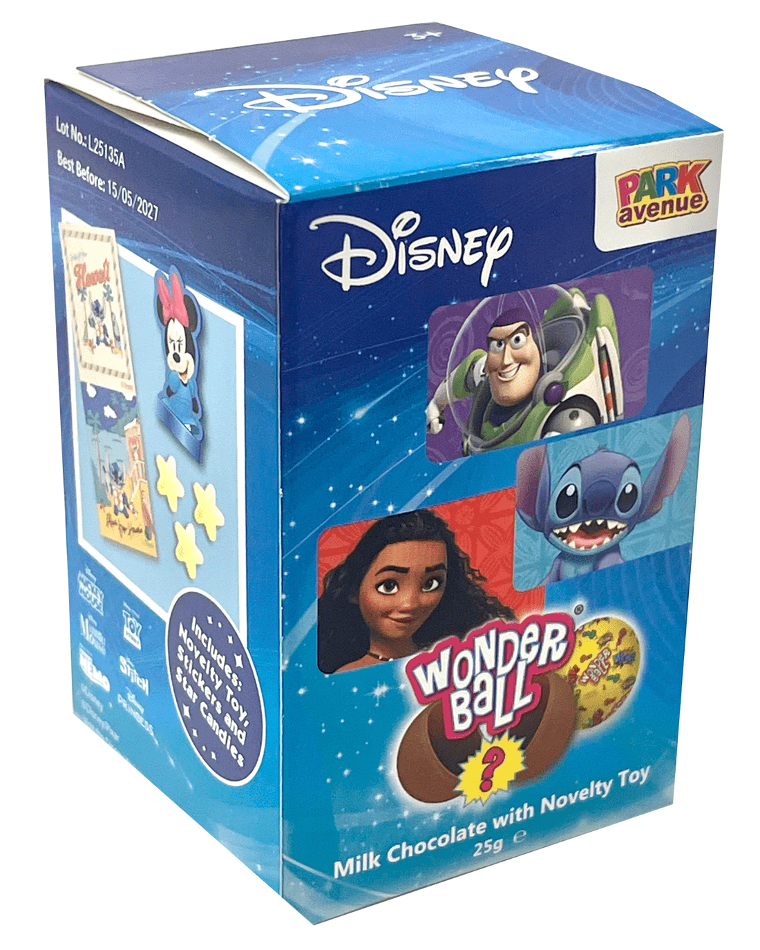 Unwrap your Disney Wonderball to taste the sweetness of smooth milk chocolate with yummy candy stars inside.