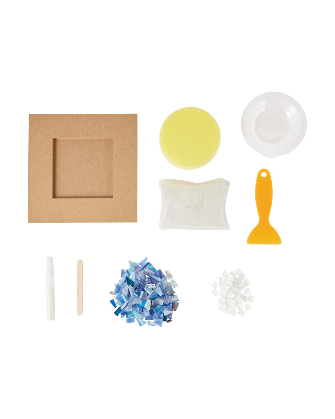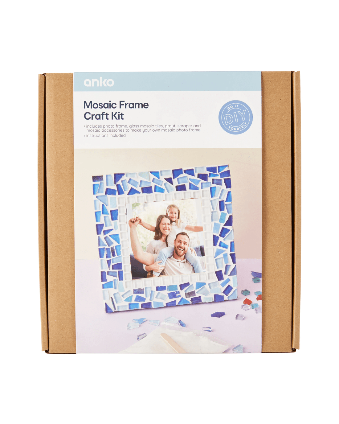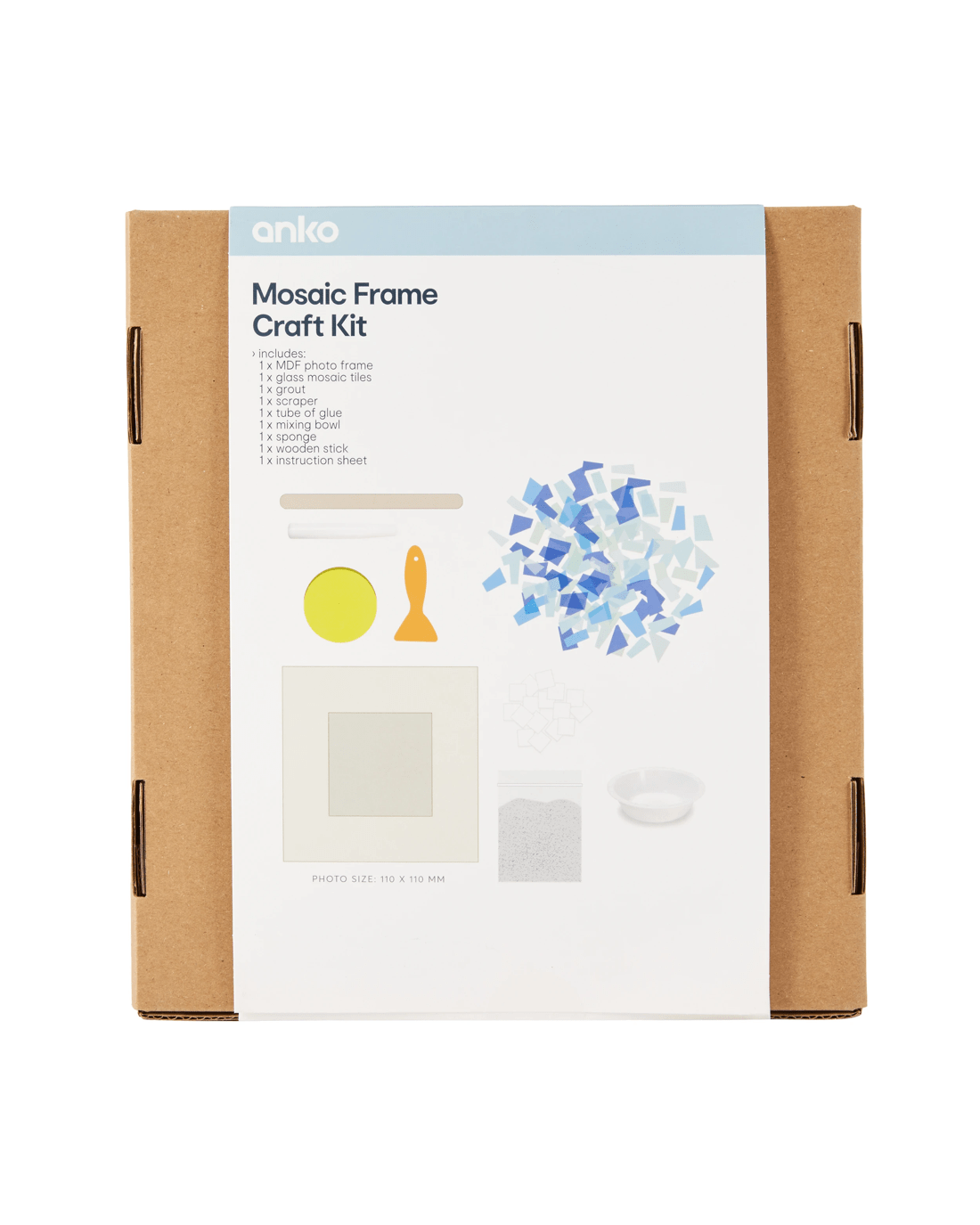 Product Details- Includes 1 x MDF photo frame, 1 x glass mosaic tiles, 1 x grout, 1 x scraper, 1 x tube of glue, 1 x mixing bowl, 1 x sponge, 1 x wooden stick and 1 x instruction sheet