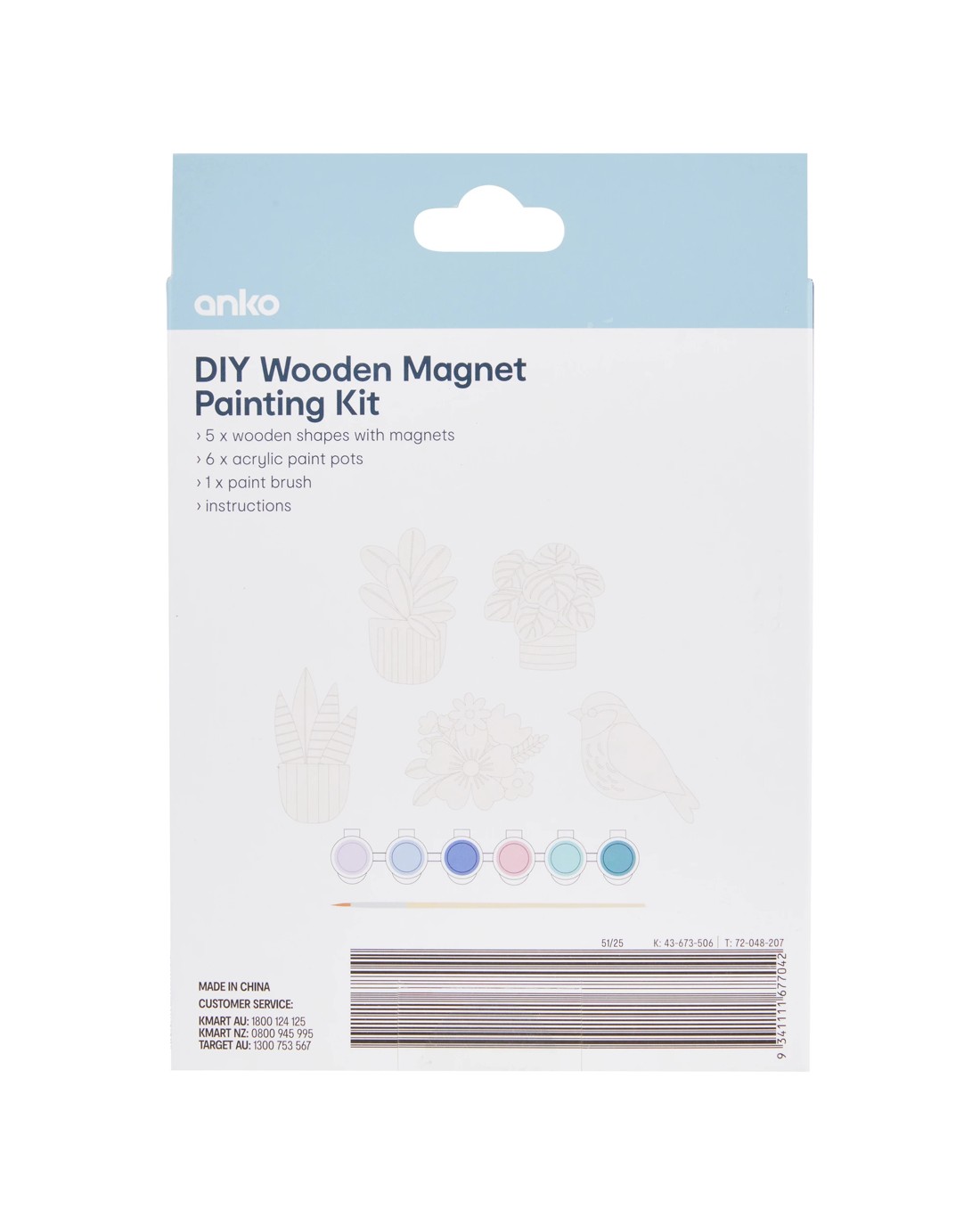 • Includes 5 x wooden shapes with magnets, 6 x acrylic paint pots, 1 x paint brush and instructions