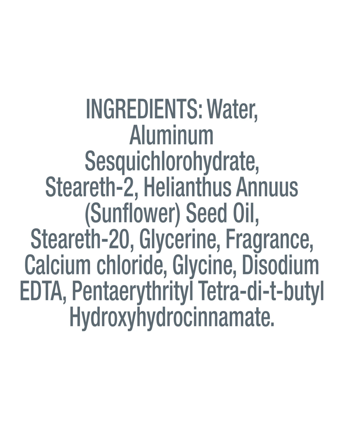 • Ingredients: Water, Aluminum Sesquichlorohydrate, Steareth-2, Helianthus Annuus (Sunflower) Seed Oil, Steareth-20, Glycerine, Fragrance, Calcium Chloride, Glycine, Disodium EDTA and Pentaerythrityl Tetra-di-t-Butyl Hydroxyhydrocinnamate