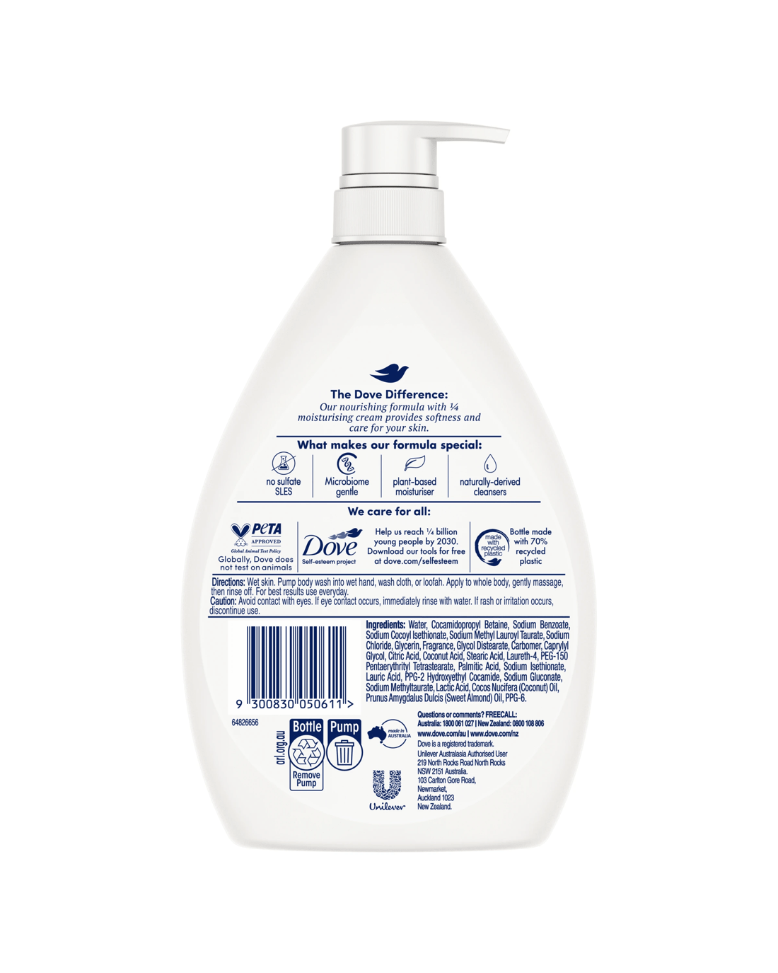 - Directions for use: Pump Dove Body wash into hand or puff and work into a creamy lather. Apply to whole body, then rinse off with clear water after gentle massage. For best results use everyday.