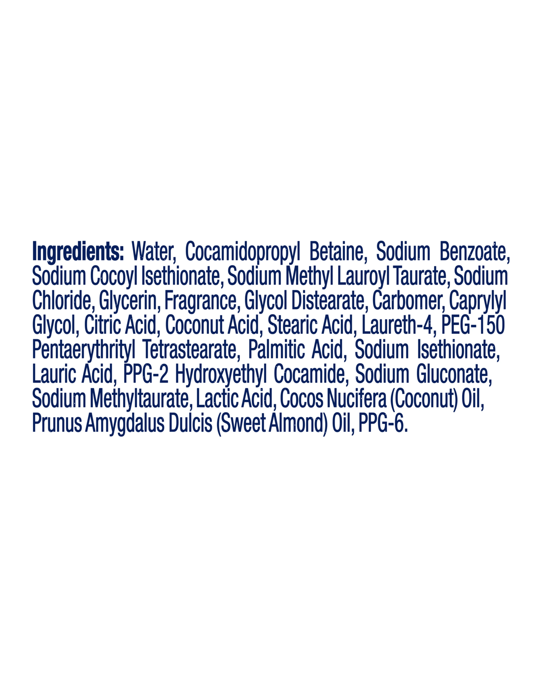 - Ingredients: Water, Cocamidopropyl Betaine, Sodium Methyl Lauroyl Taurate, Sodium Cocoyl Isethionate, Glycerin, Fragrance, Sodium Chloride, Glycol Distearate, Carbomer, Coconut Acid, Laureth-4, Sodium Isethionate, Sodium Methyl Taurate, Lauric Acid, Stearic Acid, Palmitic Acid, Phenoxyethanol, Citric Acid, Sodium Benzoate, Lactic Acid, Iodopropynyl Butylcarbamate, PEG-4 Laurate, PEG-4 Dilaurate, PEG-4, Tetrasodium EDTA, PEG-150 Pentaerythrityl Tetrastearate, PPG-2 Hydroxyethyl Cocamide, Cocos Nucifera (Coconut) Oil, Prunus Amygdalus Dulcis (Sweet Almond) Oil