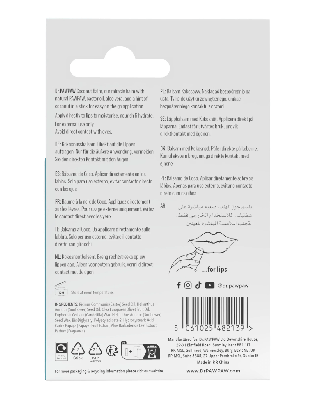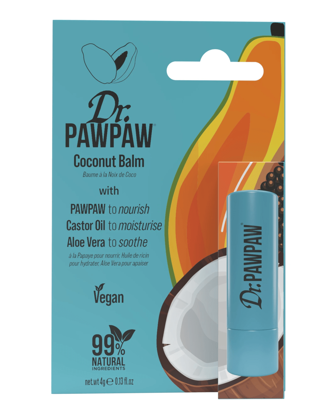 Dr.PAWPAW Coconut Lip Balm is a vegan and 99% natural miracle balm in a stick for easy on-the-go application. Infused with our award-winning blend of hero ingredients, PAWPAW to nourish, aloe vera to soothe, olive oil and castor oil to moisturise. With a hint of coconut for the ultimate tropical experience.
