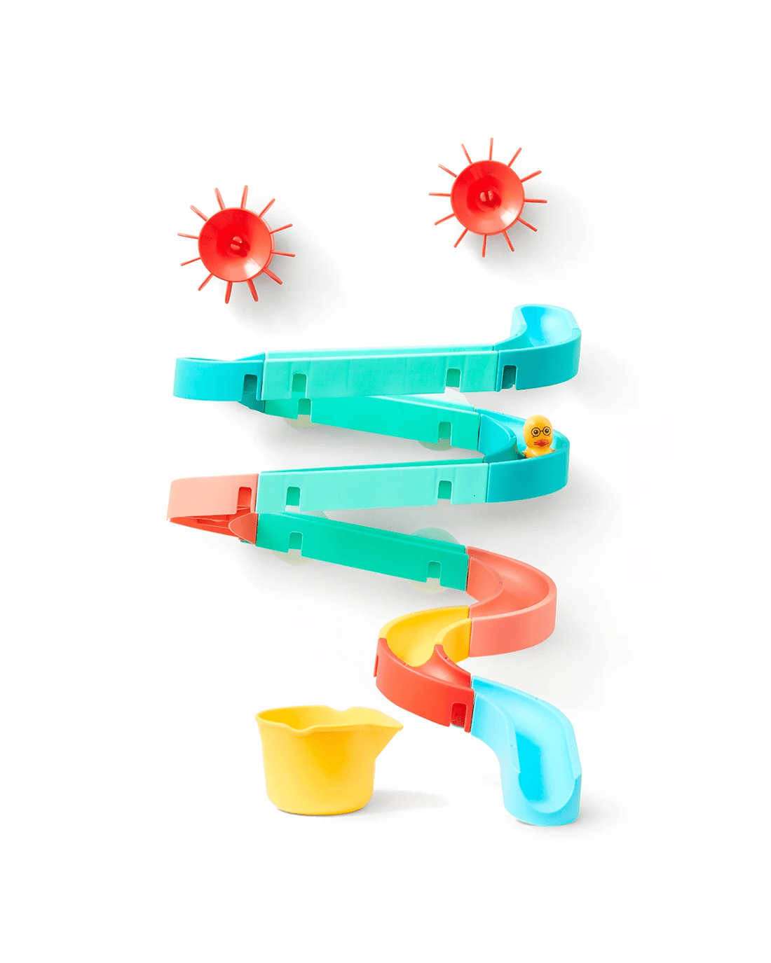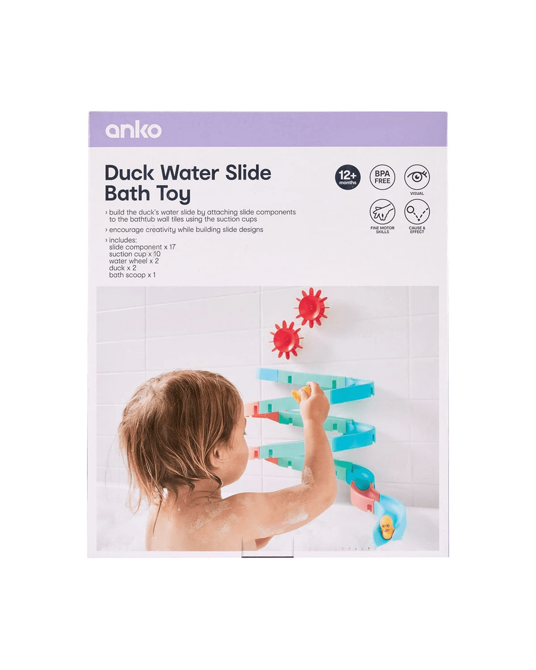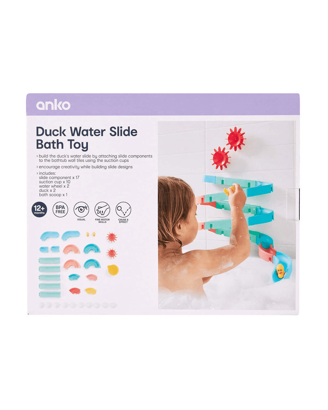 - Includes 17 x slide components, 10 x suction cups, 2 x water wheels, 2 x ducks and 1 x bath scoop