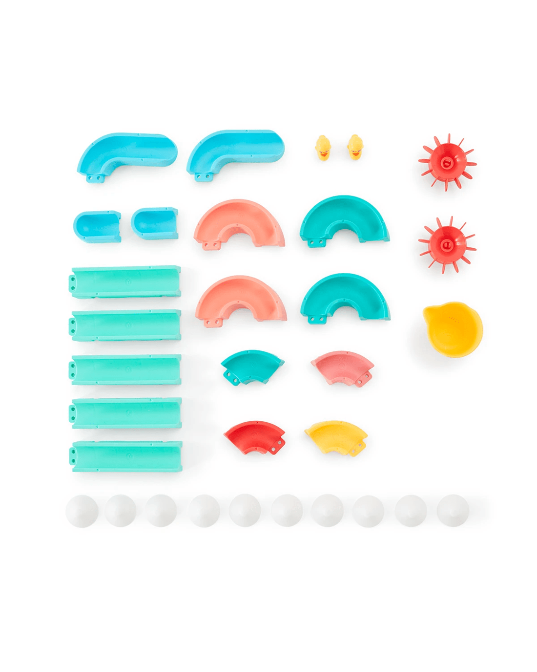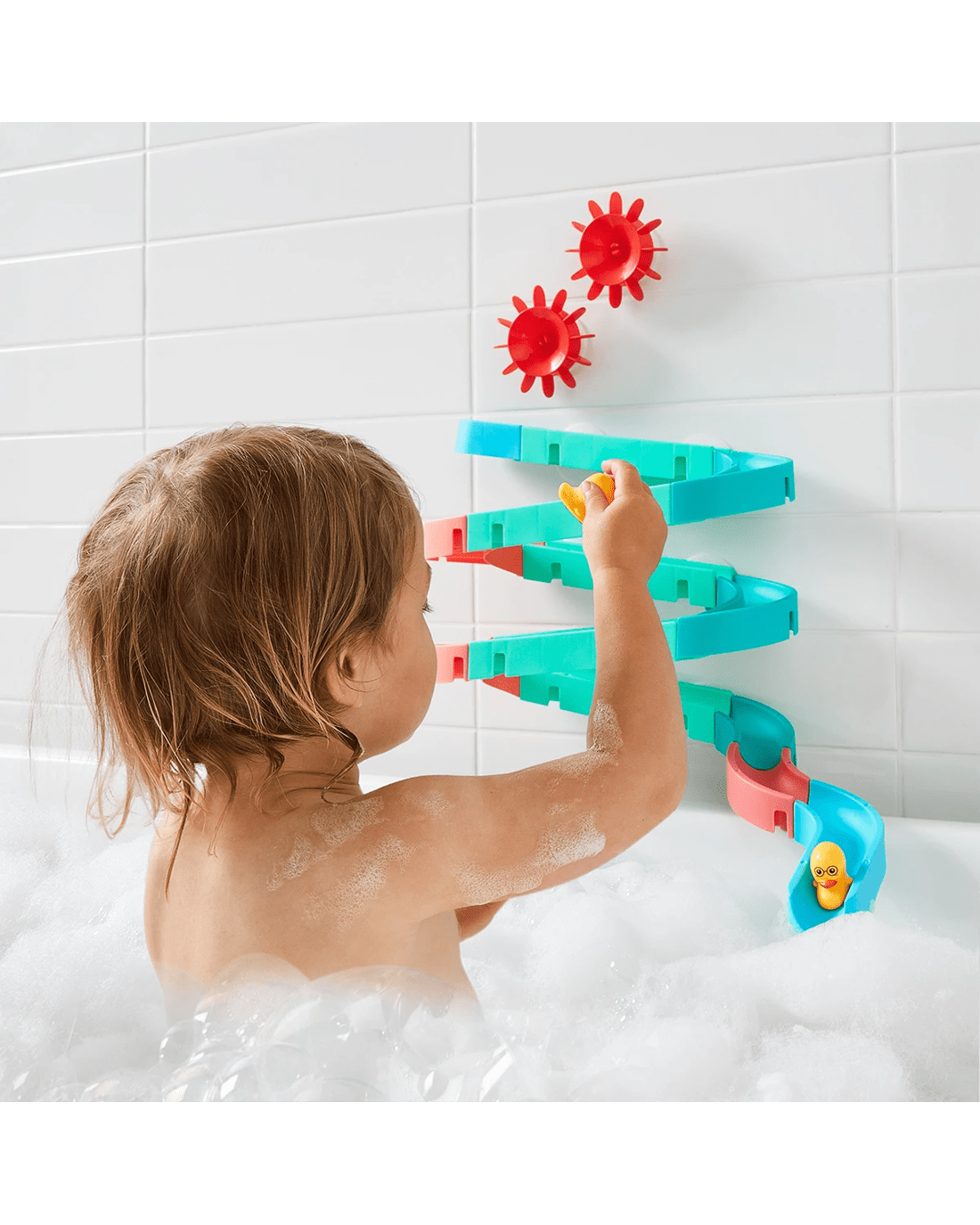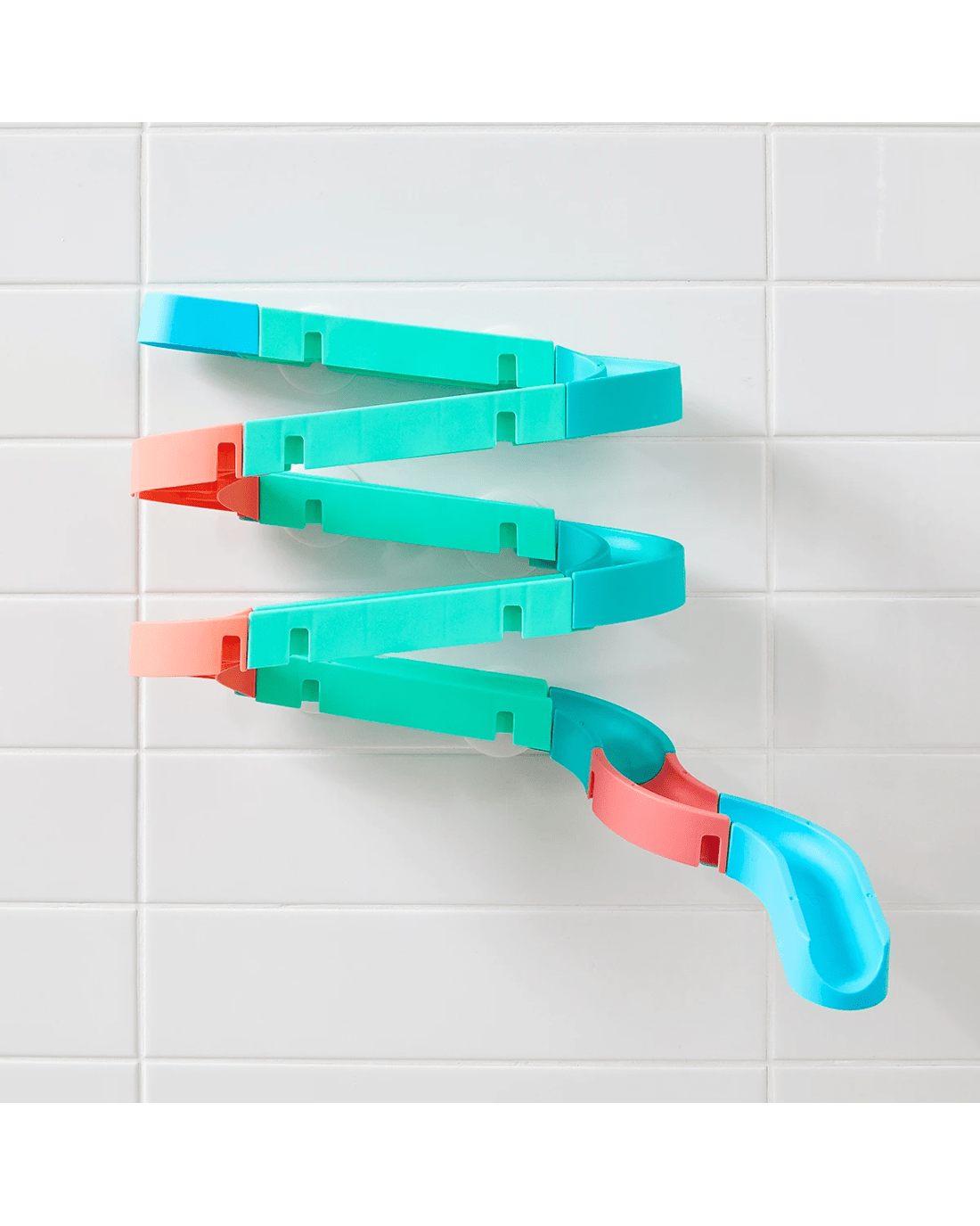 - Includes 17 x slide components, 10 x suction cups, 2 x water wheels, 2 x ducks and 1 x bath scoop