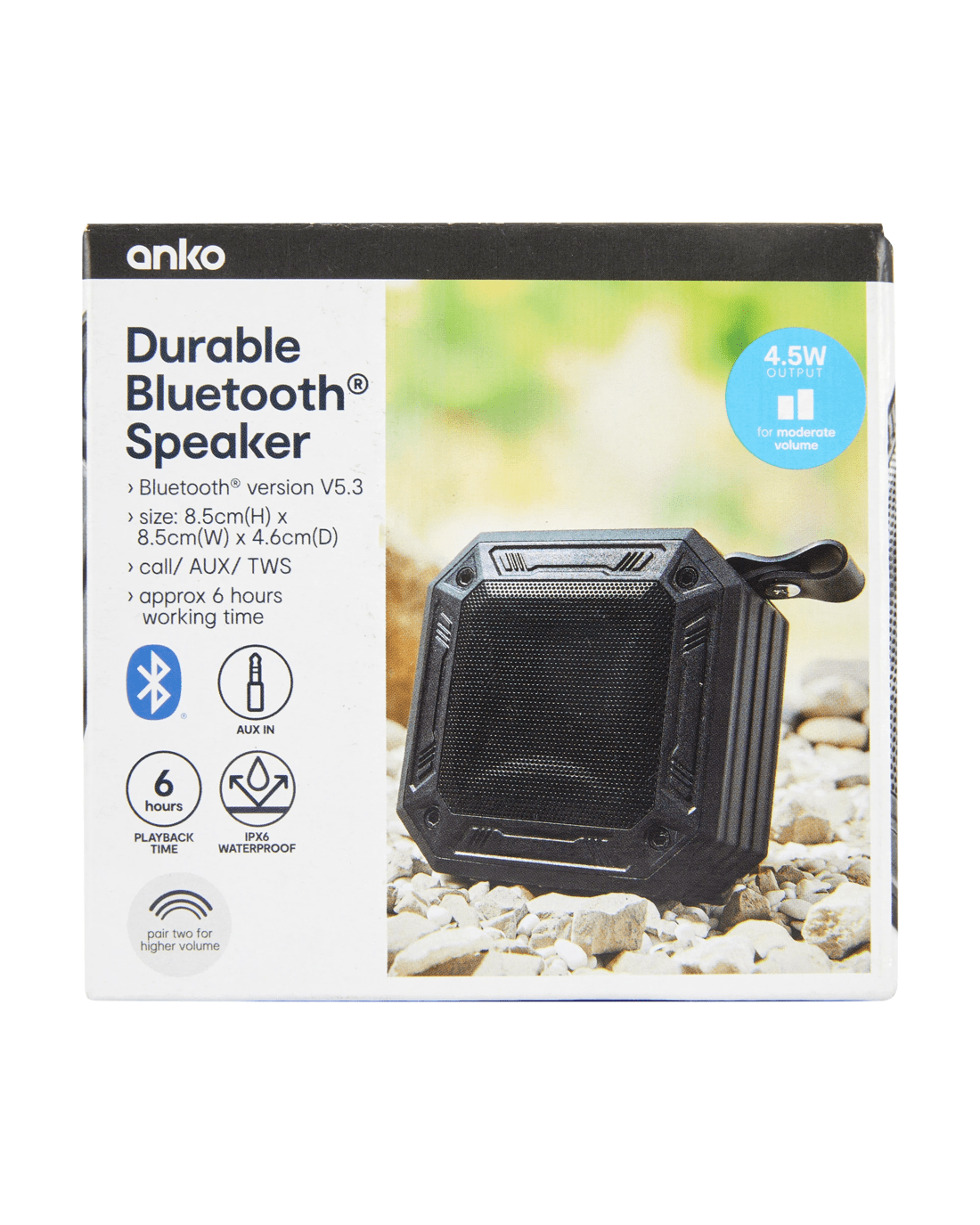- Includes 1 x durable Bluetooth speaker, 1 x USB-A to USB-C charging cable and 1 x user manual