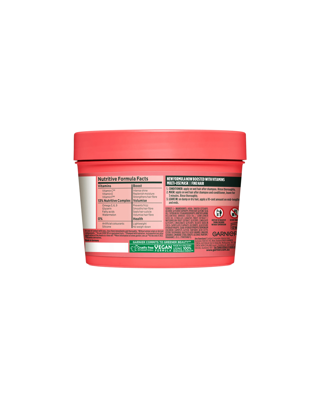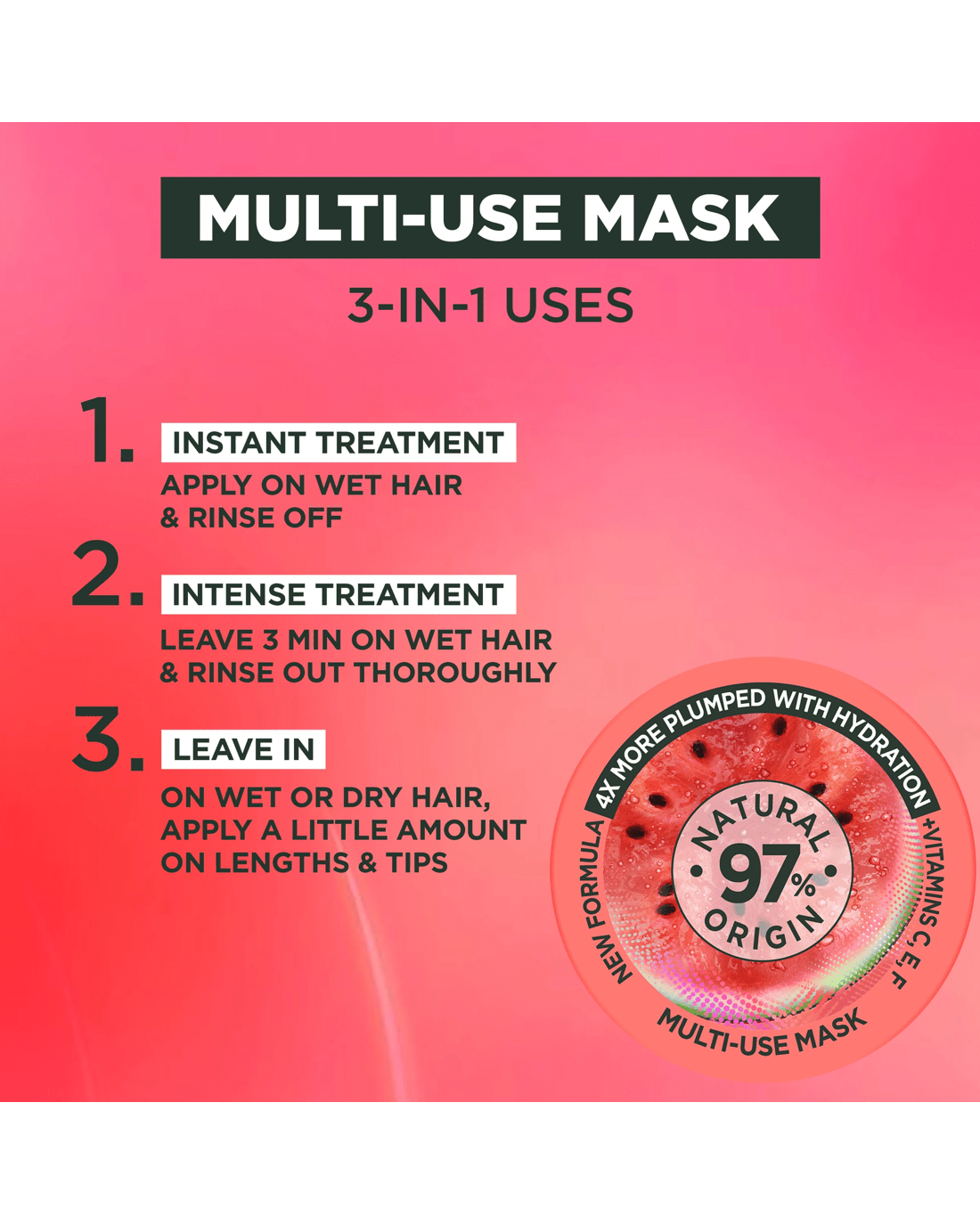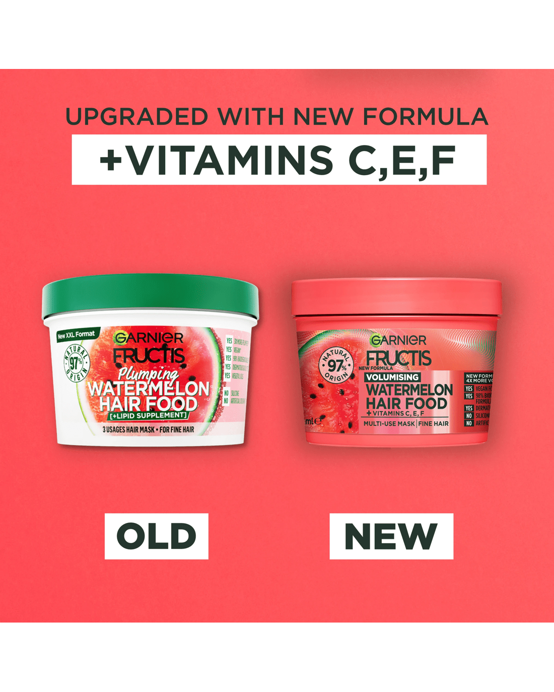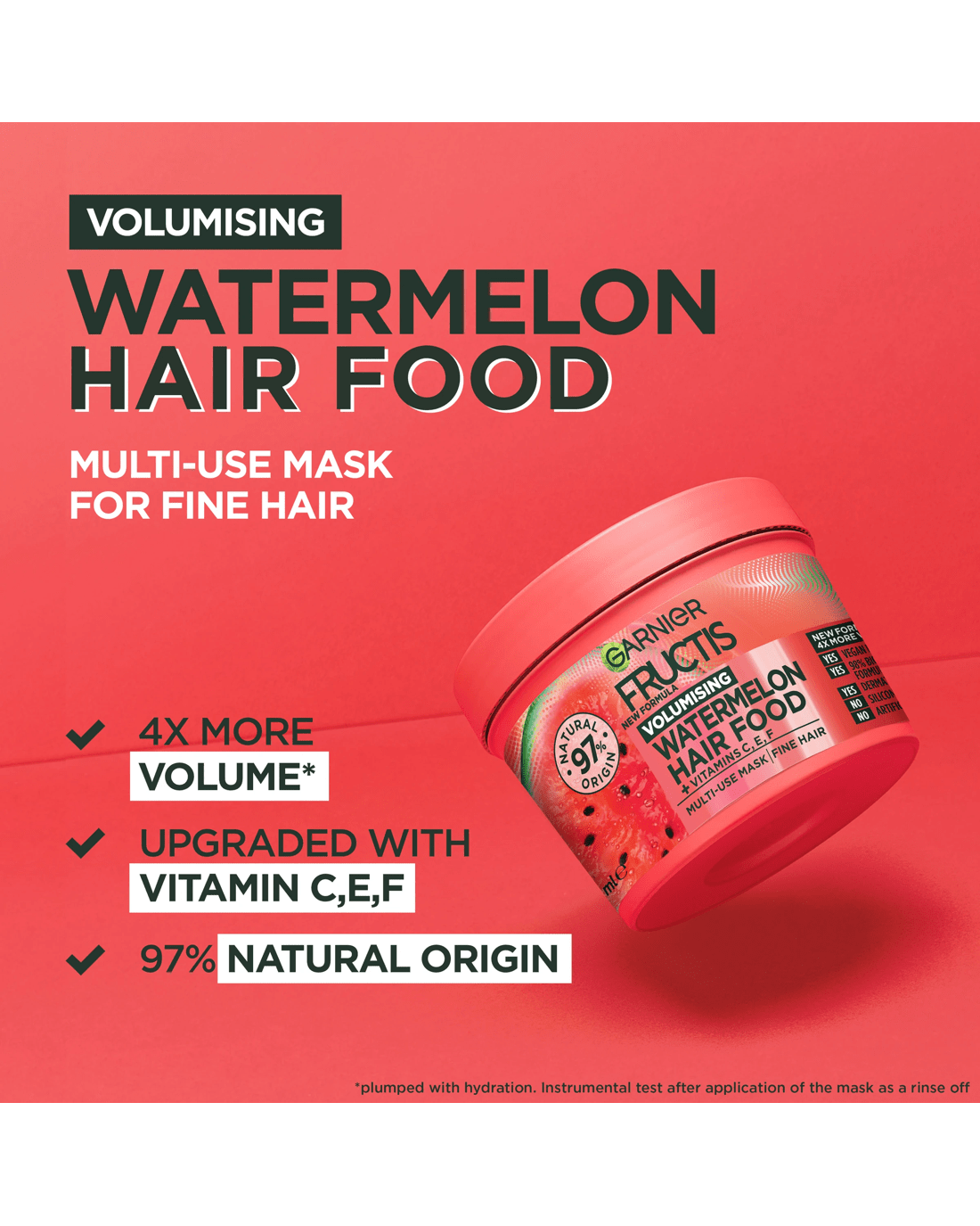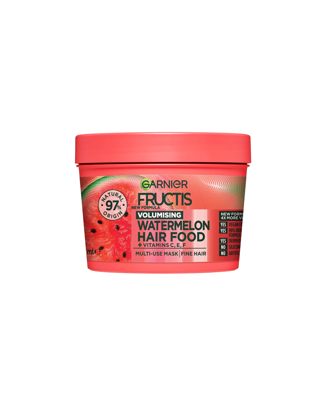Discover Fructis' Watermelon Hair Food multi use treatment by Garnier. With 97% natural origin ingredients and enriched with volumising watermelon extract to give volume, bounce and movement to fine hair.