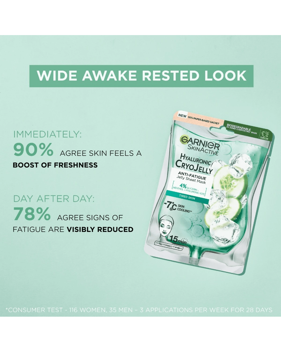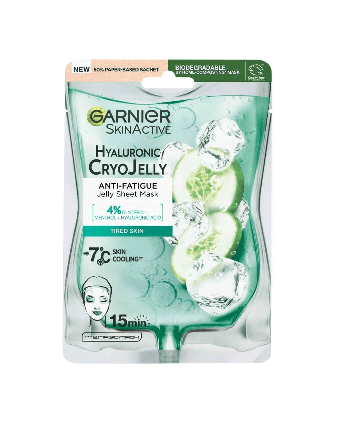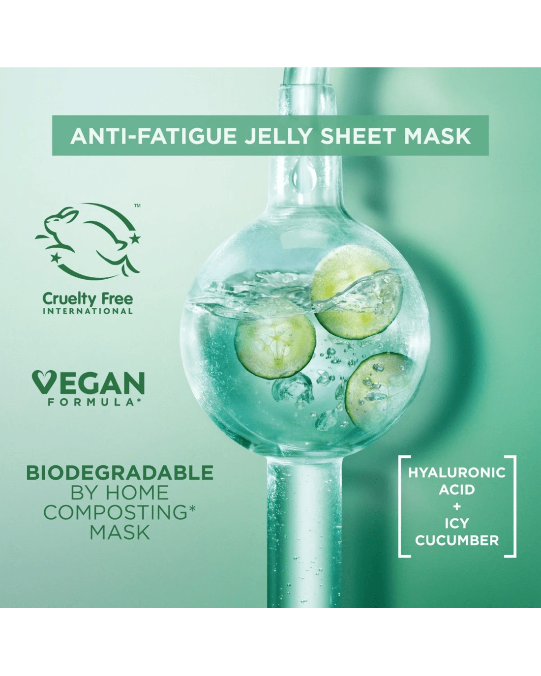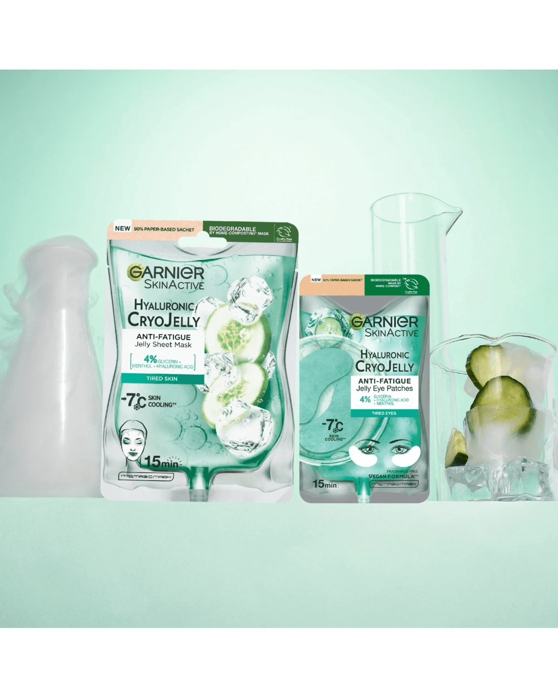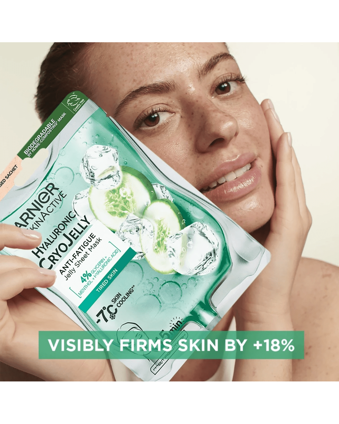 Discover Garnier's NEW Cryo Jelly Anti-Fatigue Jelly Sheet Mask, a second-skin-like jelly mask that cools skin's temperature by -7 deg. C* and instantly minimises signs of fatigue, instantly and visibly firming the skin by 18%. Enriched with hyaluronic acid, known for its super hydrating benefits and for improving the suppleness and softness of the skin; Menthol, proven to soothe and refresh; and Glycerin known for its moisturising, emollient and protective properties.