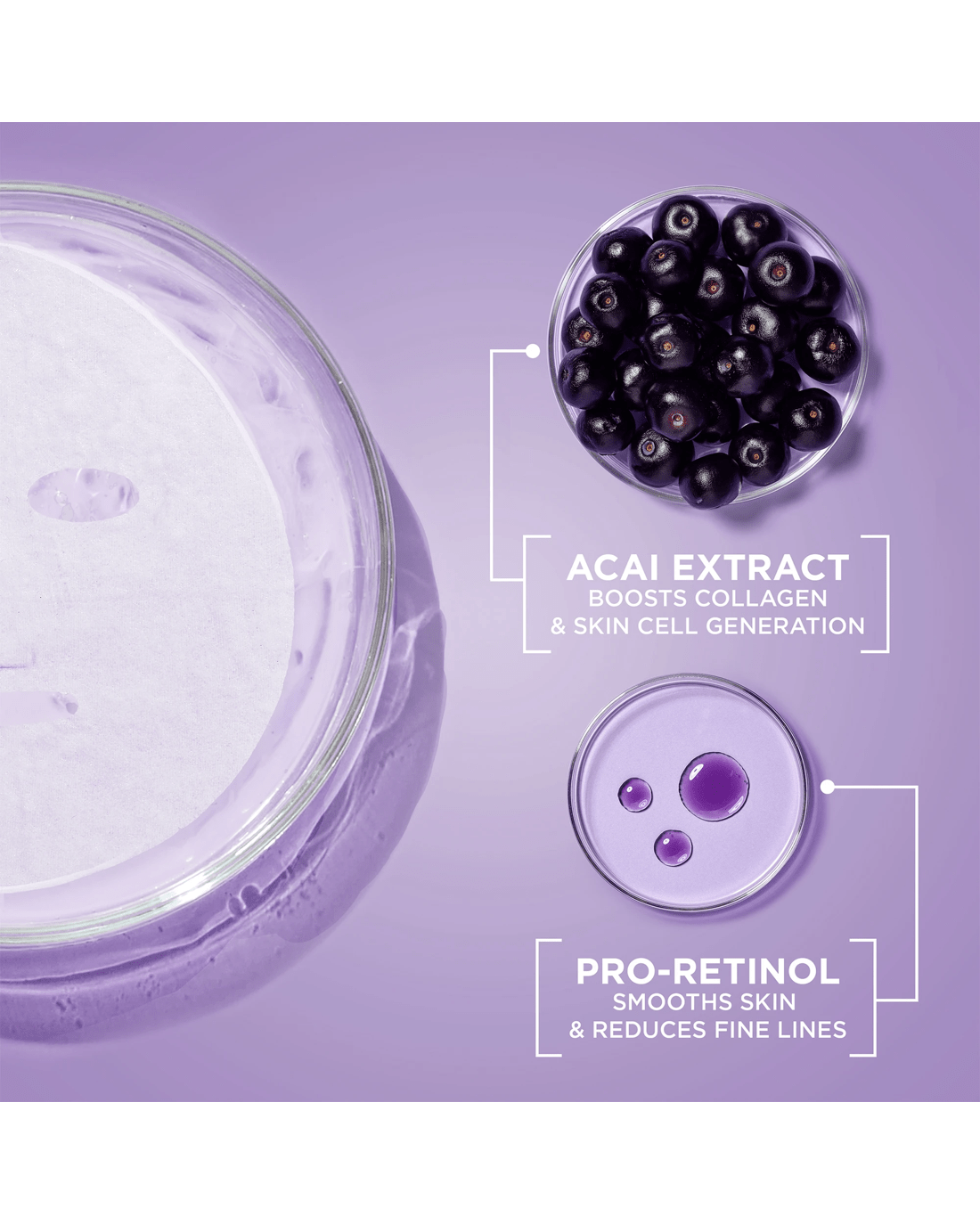 - Enriched with 3% glycerin, pro-retinol and acai extract