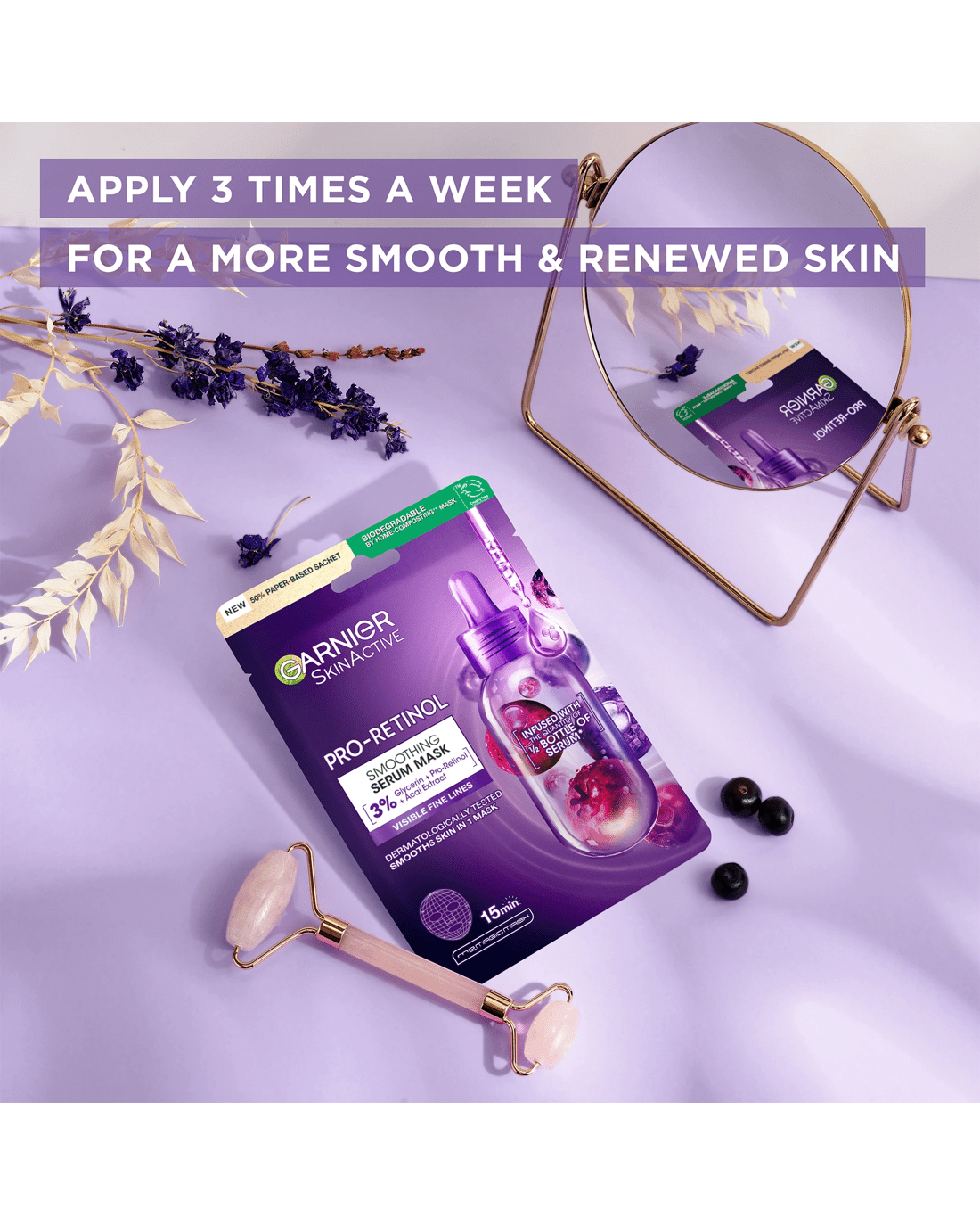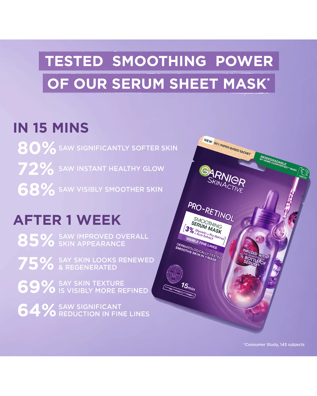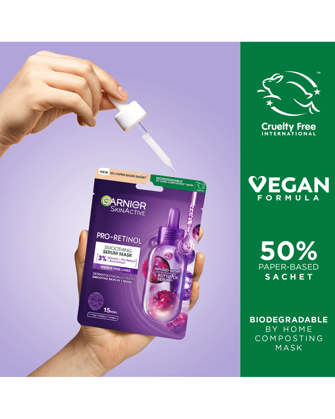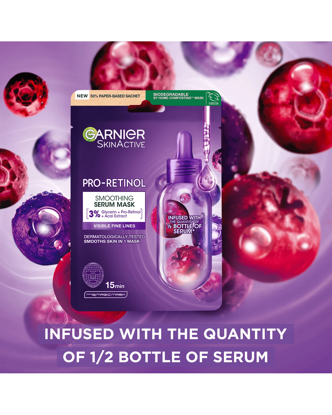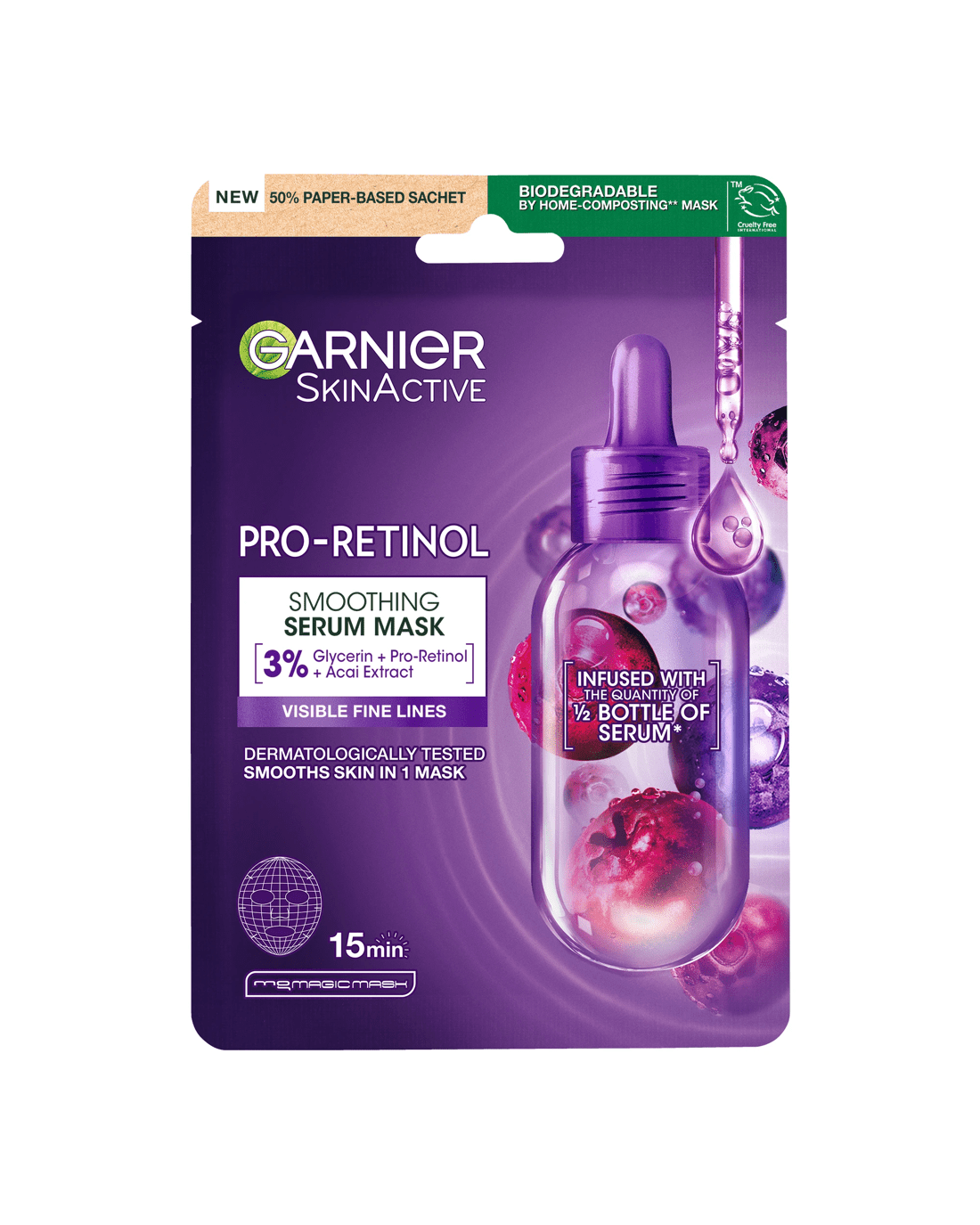 Garnier SkinActive Smoothing Serum Mask 28g - Glycerin, Pro-Retinol and Acai Extract